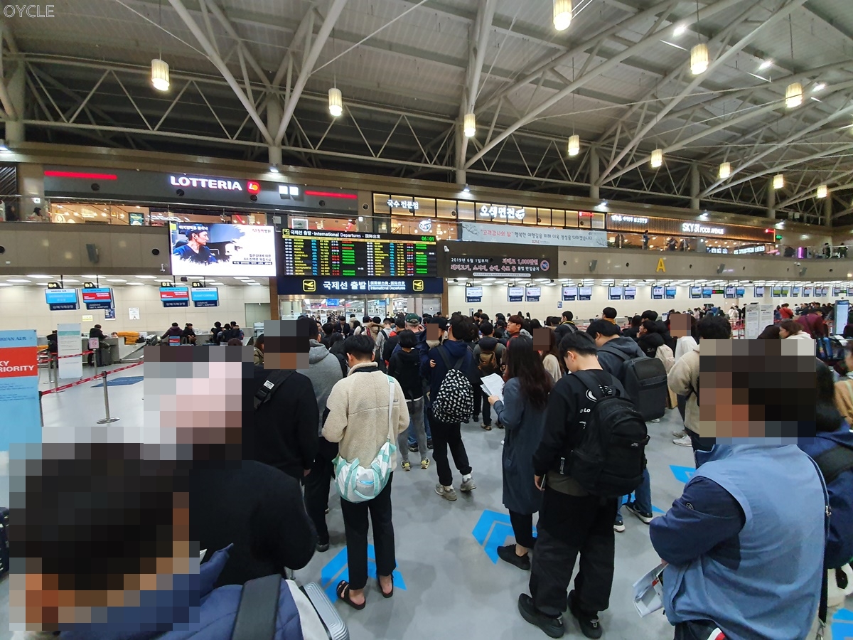 뉴스에서 김해공항의 보안 직원들이 다수 사직하여 보안검색이 오래 걸린다는 얘기가 있어서 평소보다 조금 빠른 출발 2시간 전에 공항에 도착했다. 수요일이었고 대략 이정도 인원이 공항의 보안검색을 기다리고 있었다. 이때가 오전 6시 1분.