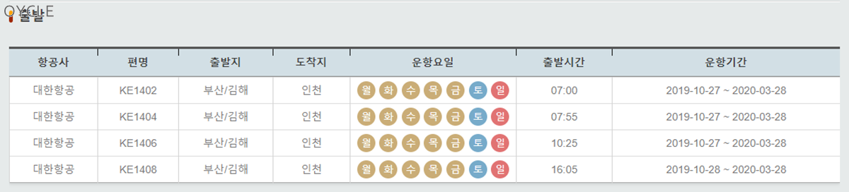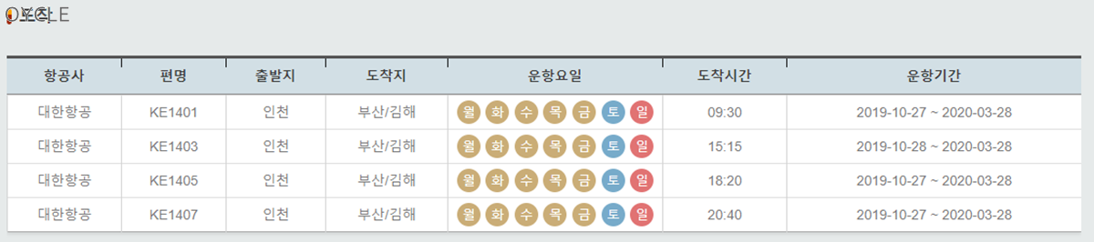 참고삼아 인천공항을 출발하여 김해공항에 도착하는 내항기 스케줄은 다음과 같다. 오전에 한편, 오후에 세편이다.
