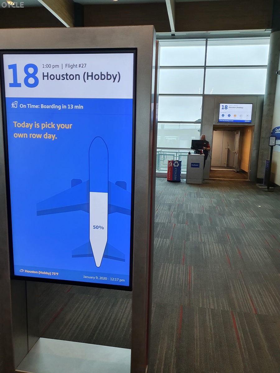 사우스웨스트 항공 본진이라 그런지 탑승 로드에 대해서도 이렇게 보여주고 있다. 내가 탑승했던 항공편은 50% 탑승률이 예상된다고 써있고, 좌석은 널널하게 앉을 수 있다며 안내해준다. 실제 탑승 직전에는 예약을 변경하여 이 항공편에 탑승한 승객이 몇명있어서인지 60%정도 탑승했다.