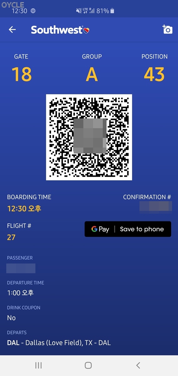 실제 탑승은 사우스웨스트항공 앱에 있는 탑승권을 이용했다.