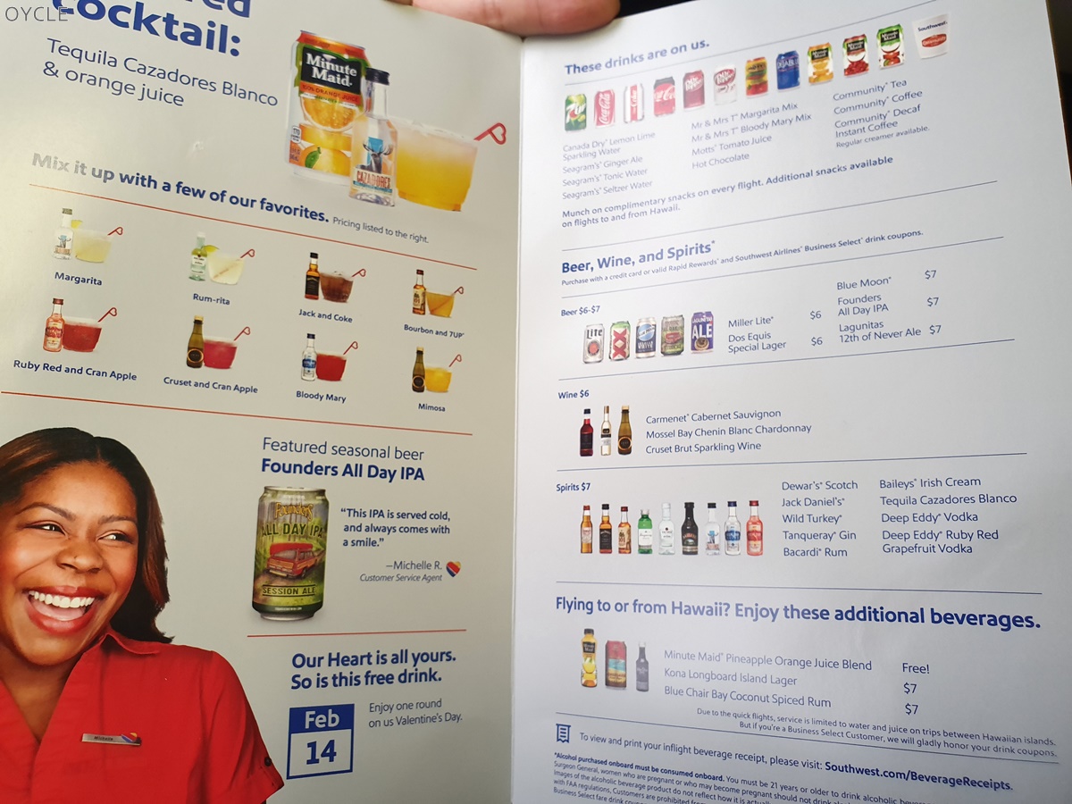 사우스웨스트항공은 항공권 가격도 저렴하고 위탁수화물도 무료인데 음료 서비스까지 제공된다. 주류빼고 거의 대부분의 음료를 무료로 선택할 수 있다.