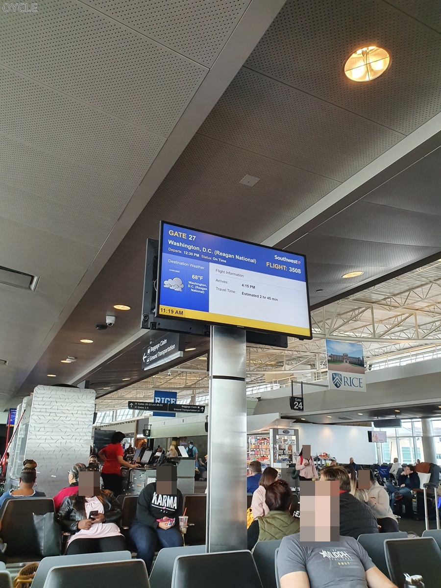 웬디스 버거를 먹고 게이트 앞으로 이동했다. 휴스턴을 오후 12시 30분에 출발하여 워싱턴DC에 4시 15분에 도착하는 스케쥴이다. 참고로 휴스턴과 워싱턴DC간에는 1시간 시차가 있으므로 약 2시간 45분 걸리는 거리다.