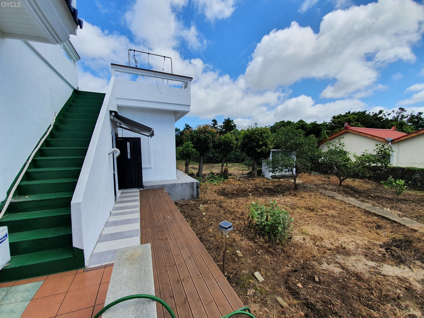 집을 우측으로 돌아가면 옥상으로 향하는 계단이 있고 계단 아래쪽으로 숙소로 들어가는 입구가 있다. 숙소 문 앞으로는 텃밭이 있는데 잡풀이 많아서 아이들이 뛰어다니며 놀기에는 부적합했다. 그래서 집 정면의 잔디밭을 많이 이용했다.
