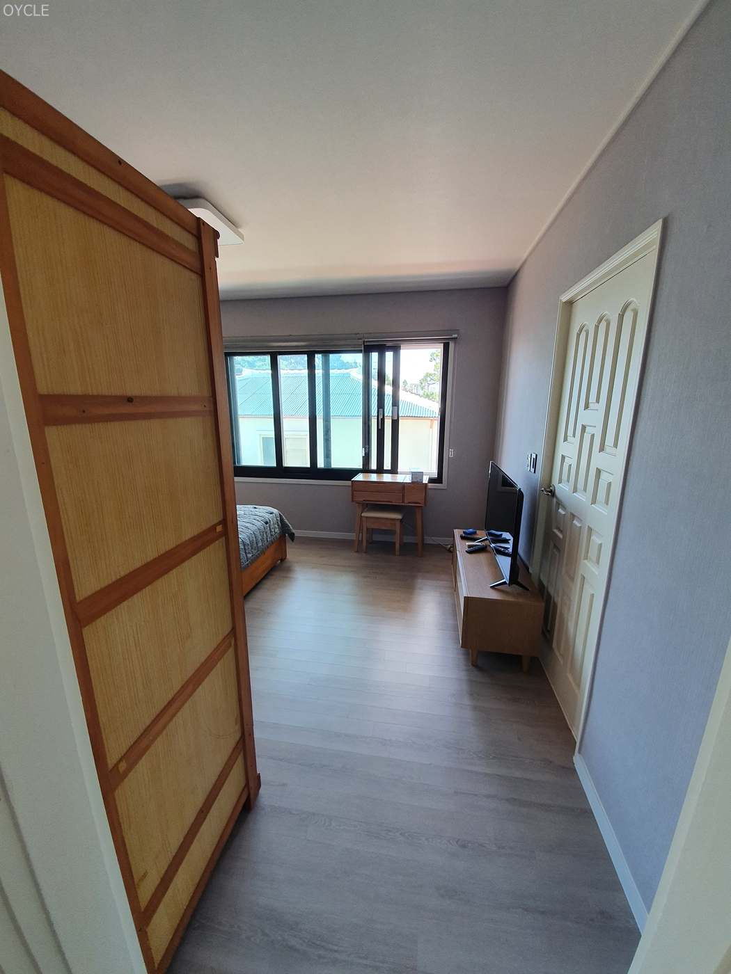 숙소에는 총 방이 두개가 있었는데 그 중 큰 방이다. 퀸 사이즈 침대가 잇고 장농 등 수납할만한 공간은 충분했다. 저 문이 조금 아이러니하다. 전체 집을 반으로 쪼개서 반은 주인분이 사용한다고 했는데 저 문은 주인분이 사용하는 공간과 손님이 사용하는 공간의 비무장지대같은 공간(빈 공간)으로 향하는 문이다. 저 공간덕분에 서로간의 소음은 들리지 않을 것 같으나 방안에 문이 있어서 조금 어색했다.