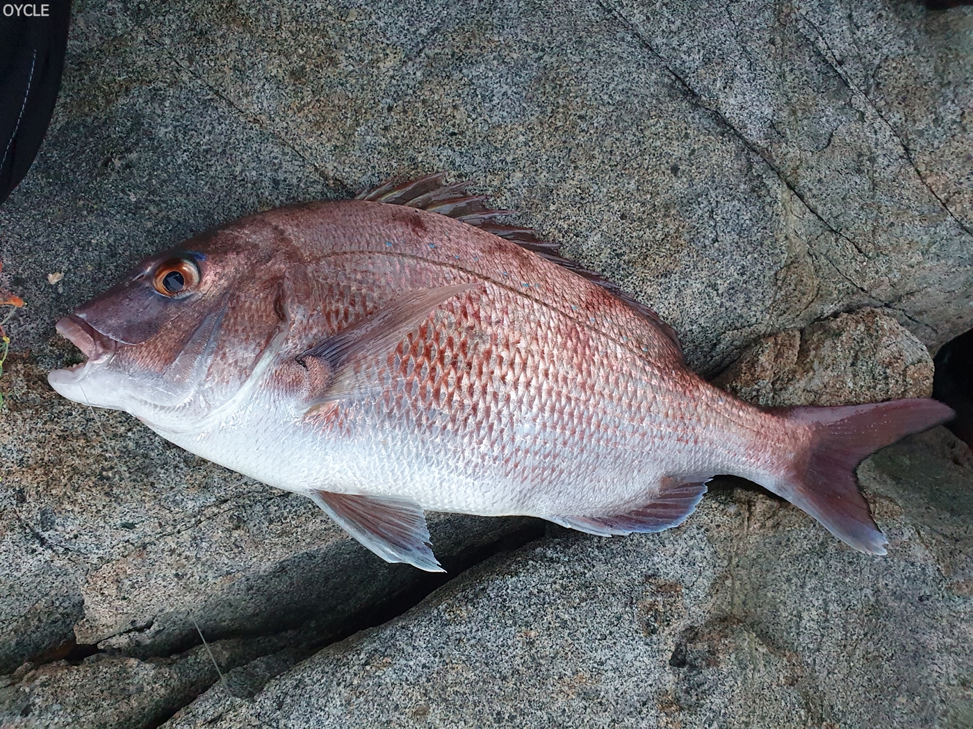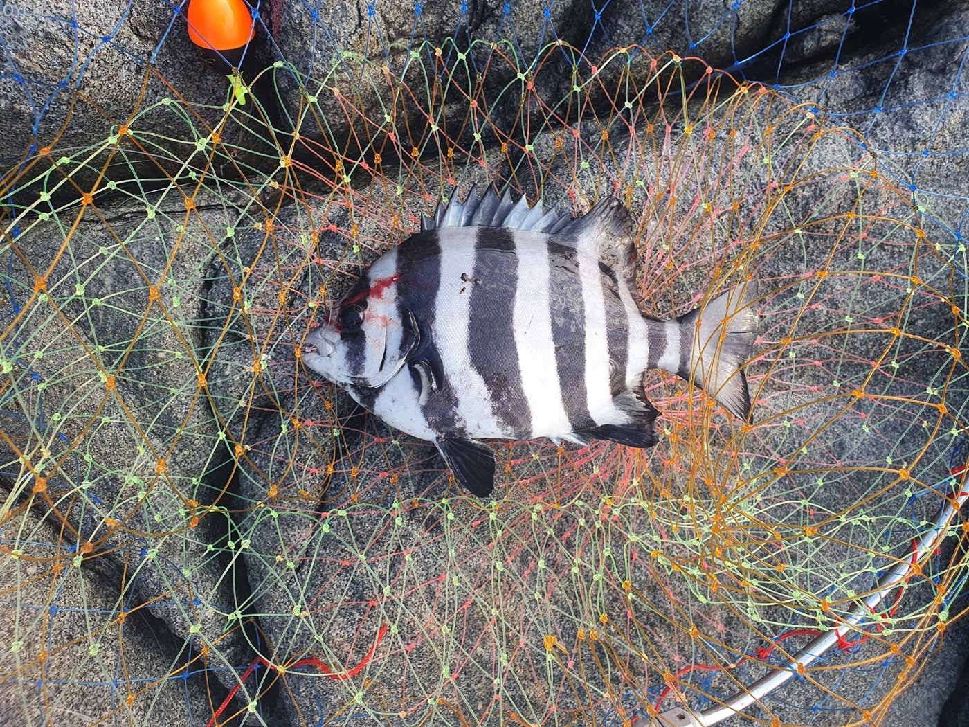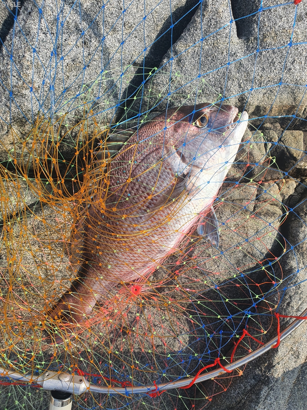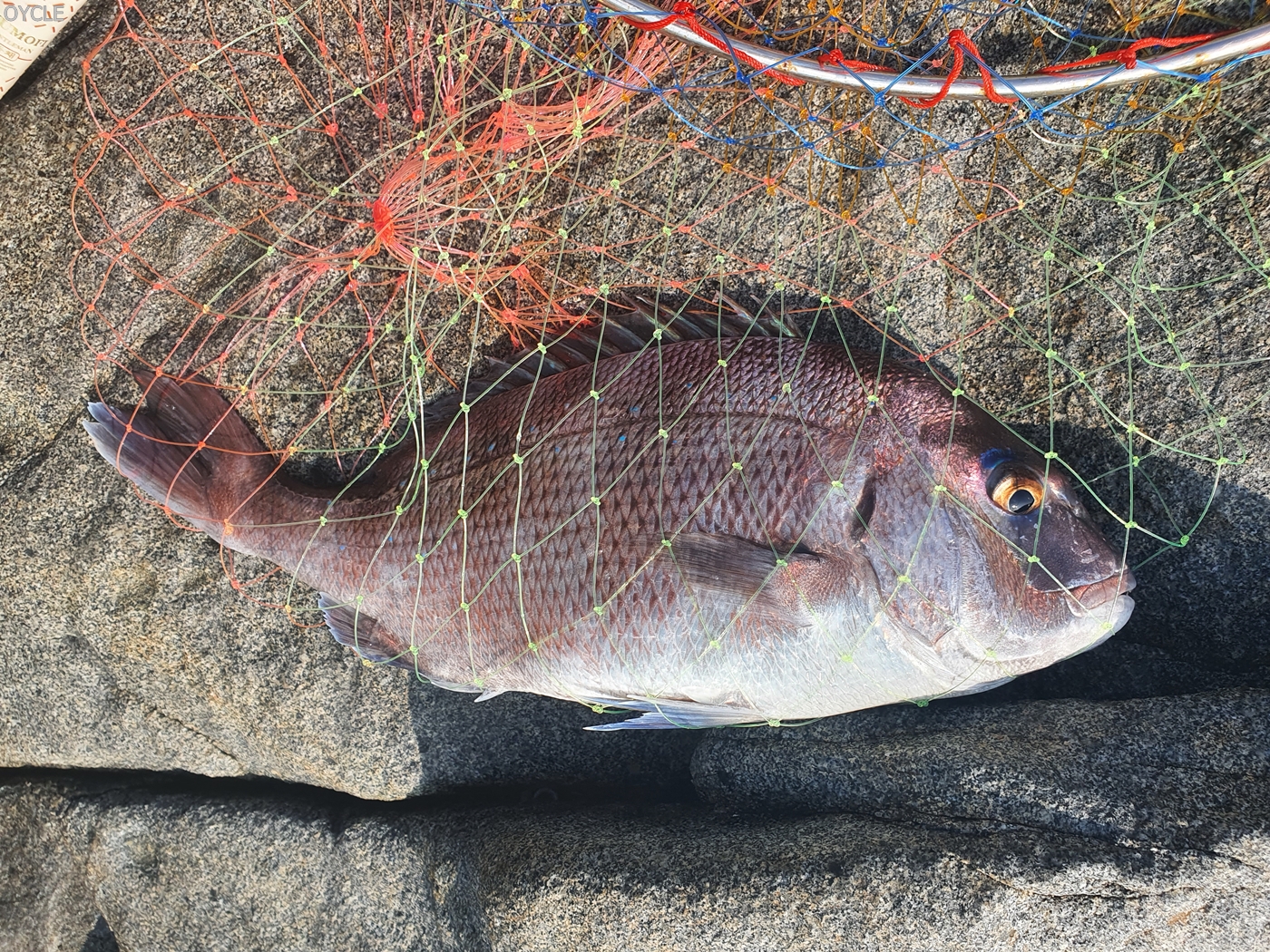 그리고 약 10분뒤 40센치 갓 넘는 참돔의 입질을 받았고 비탈질 경사에서 조심스럽게 뜰채질을 해 건질 수 있었다.