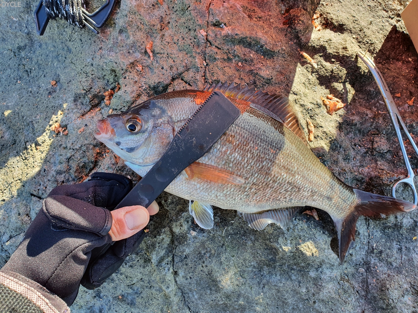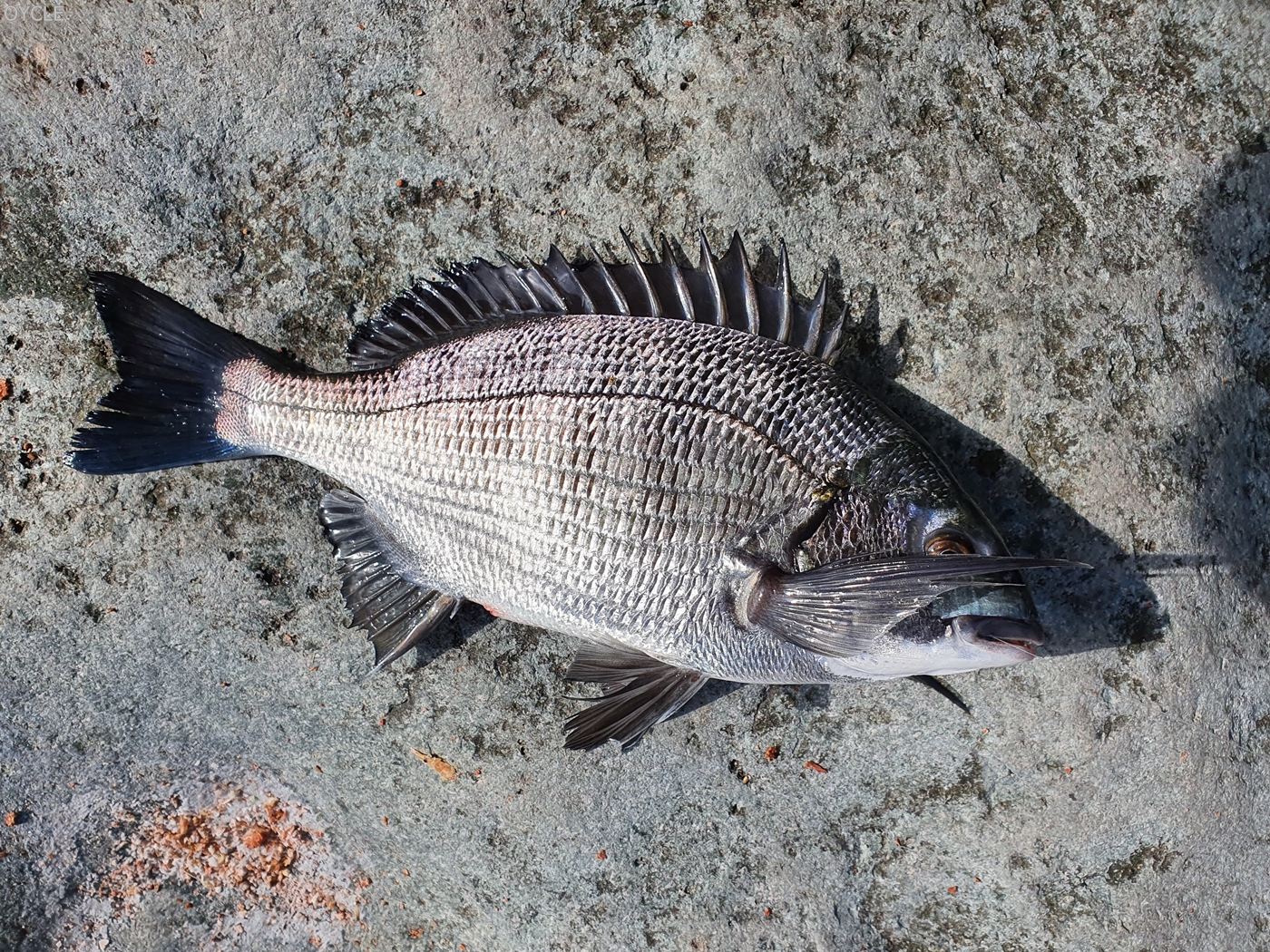 오후 1시경 전혀 입질이 들어올만한 물때도 시간도 아니었는데 덜컥 한마리가 옥수수를 물고 올라왔다. 기대도 안하던 물고기가 올라와 당황했지만 잘 올려냈다. 집에와서 재보니 35센치정도의 감성돔이었다.
