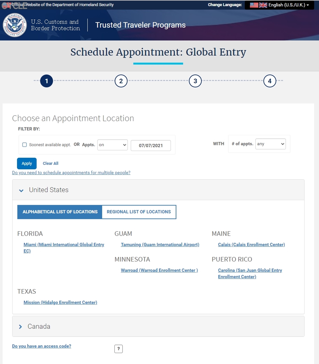혹시나 참고삼아 2021년 7월 글로벌엔트리 인터뷰 예약이 가능한 곳을 올려둔다. 아직 먼 미래라 인터뷰스케줄이 나오지 않은 office가 많아 6개 장소만 뜨는 것으로 보인다.