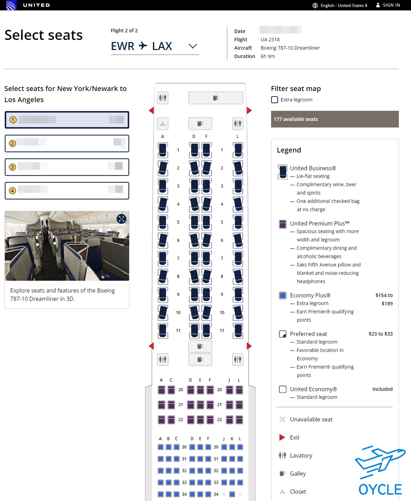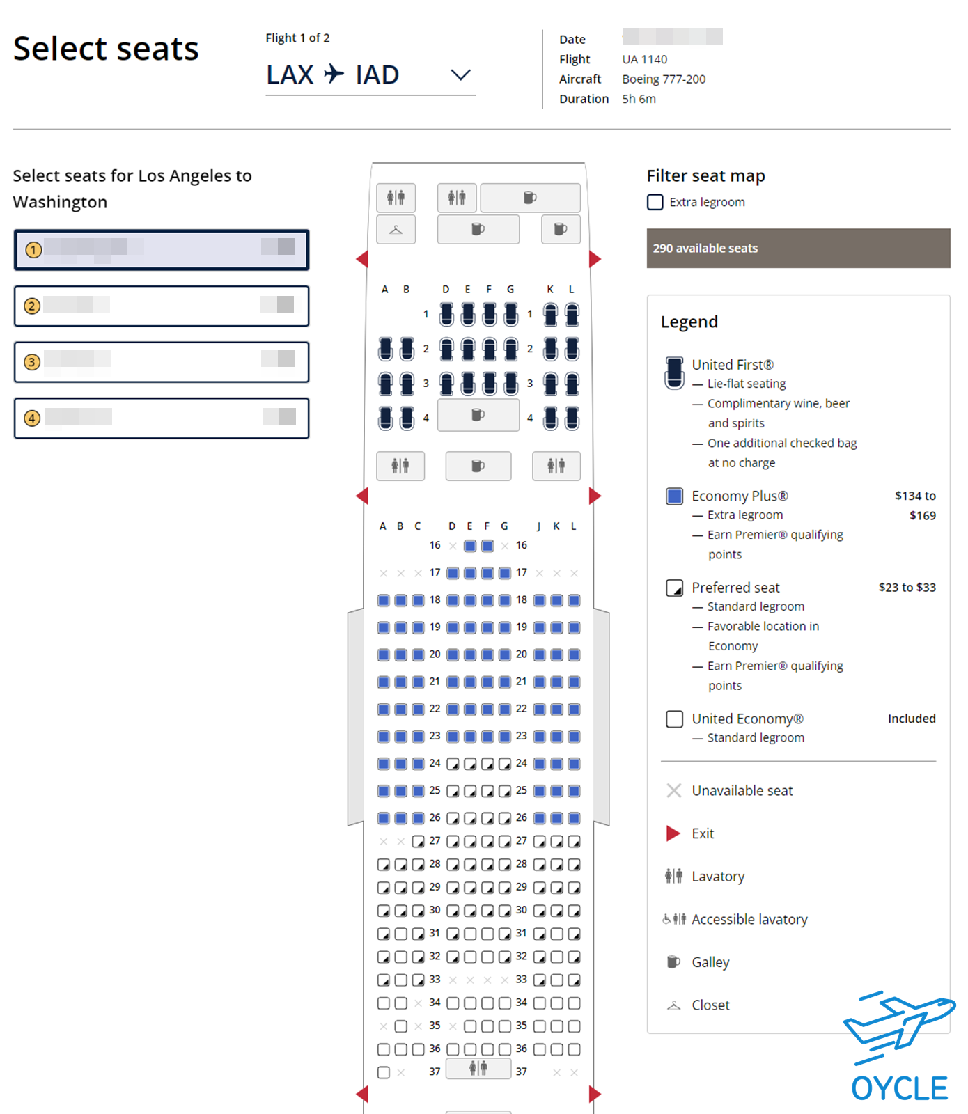 다행히 무료로 좌석지정이 가능했다. 대부분의 앞쪽 자리는 preferred seatfh 묶여있어서 추가금을 지불해야 했다. 워싱턴DC로 향하는 항공편의 경우 3-4-3의 배열의 B777-200 항공기였는데 거의 맨 뒤쪽엔 2-4-2 배열이 일부 있어서 맨 뒷자리 두자리씩 두 열을 지정했다.