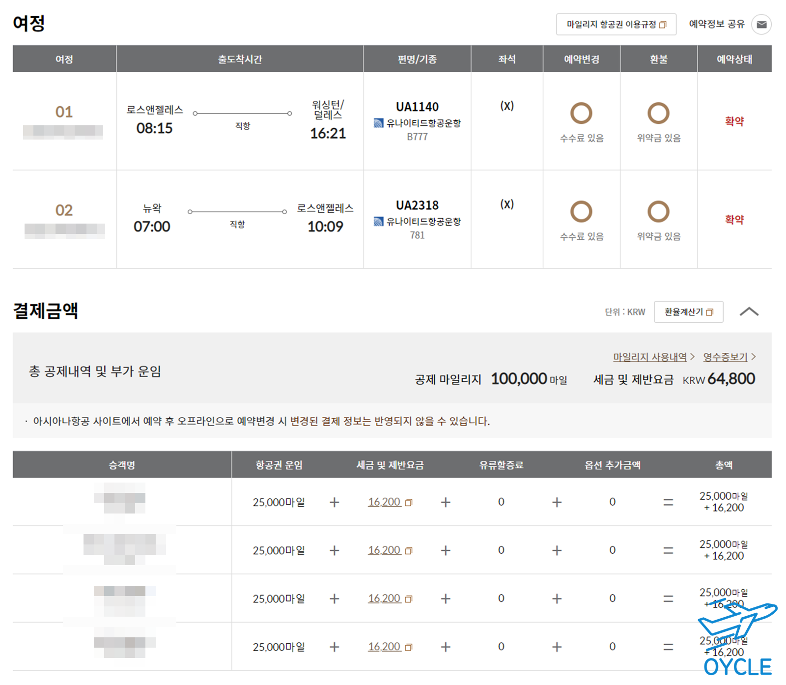 아시아나항공 마일리지로 유나이티드항공 미국 국내선 발권 요약