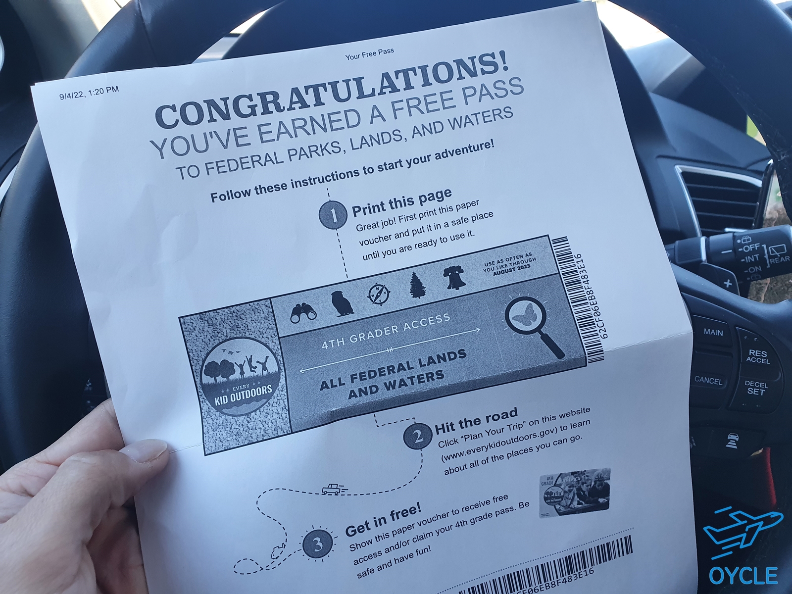 국립공원 사이트에서 클릭만 하면 위와 같은 바우처를 얻을 수 있는데 이를 국립공원 출입구의 직원에게 제출하면 패스 카드로 교환해준다. (바우처 신청과 출력하는 사이트 https://www.everykidoutdoors.gov/index.htm ). 이름이나 학교 정보 같은 것도 전혀 필요 없다. 클릭 만하면 받을 수 있다.