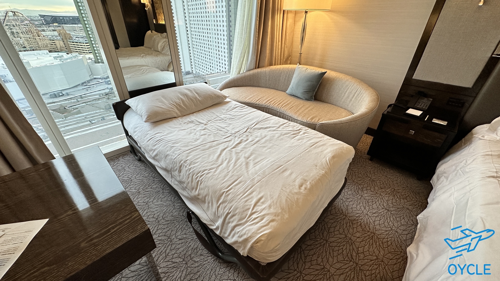 객실에 들어오고 얼마 안있어서 룸으로 가져다준 엑스트라 베드. 엑스트라 베드가 접히는게 아니고 통째로 된 침대라 전혀 불편함이 없었다. 엑스트라 베드라고 해서 라꾸라꾸 침대 같은걸 가져다 주는 곳이 있는데 그건 정말 불편해서 걱정했으나 기우에 불과.