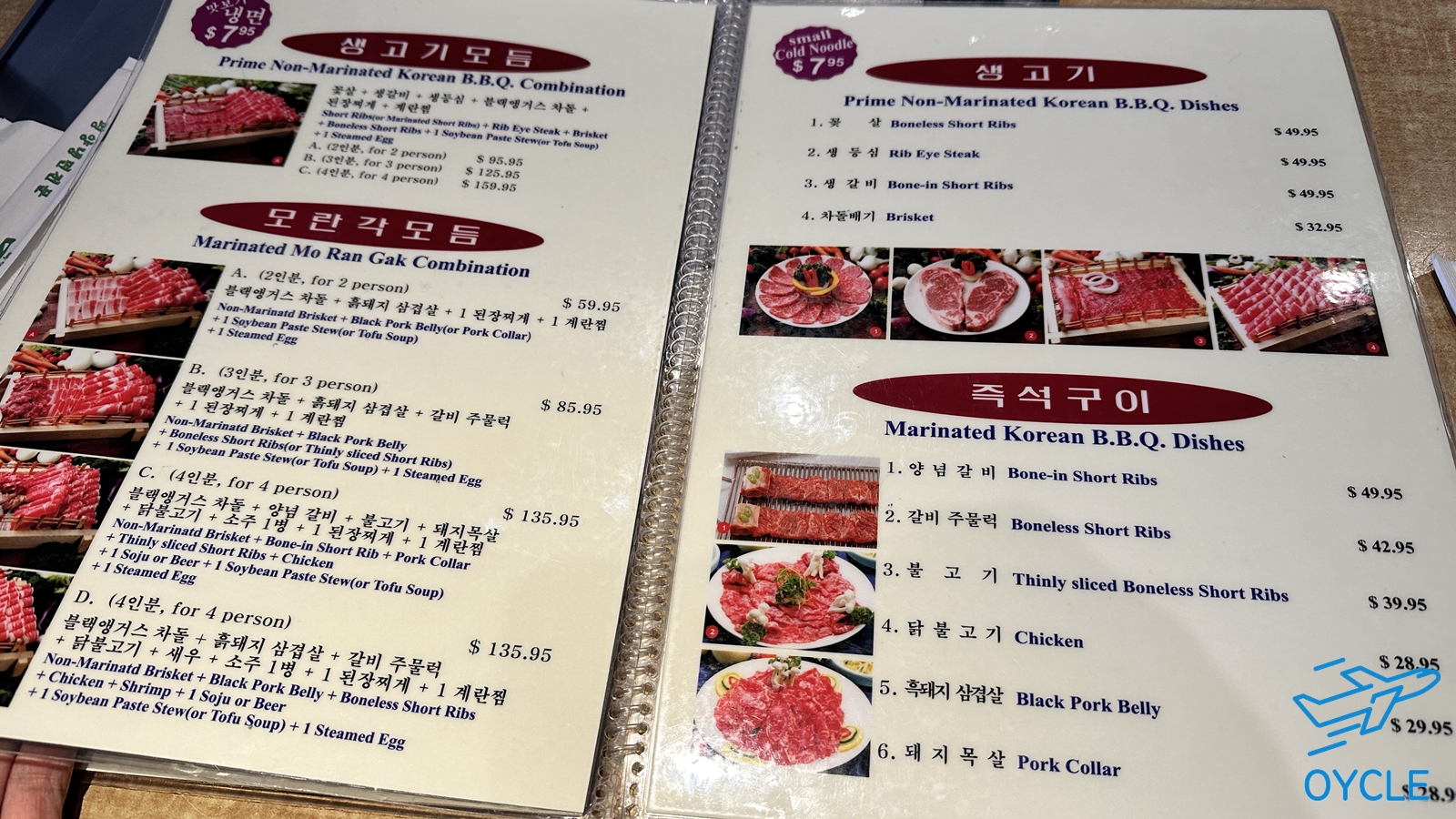 모란각은 식당 간판에서도 볼 수 있듯이 Korean BBQ 집이다. 고기 구이는 미국 어딜가든 가격대가 있는 편이다. 우리가족은 고기먹으러 온것이 아니라 냉면을 먹으러 왔기에 고기 메뉴는 사진만 찍고 패스.
