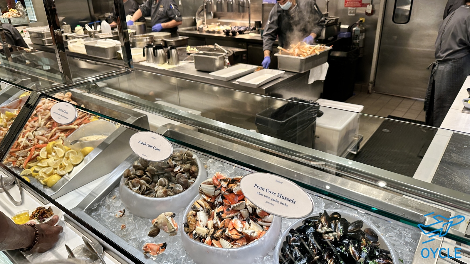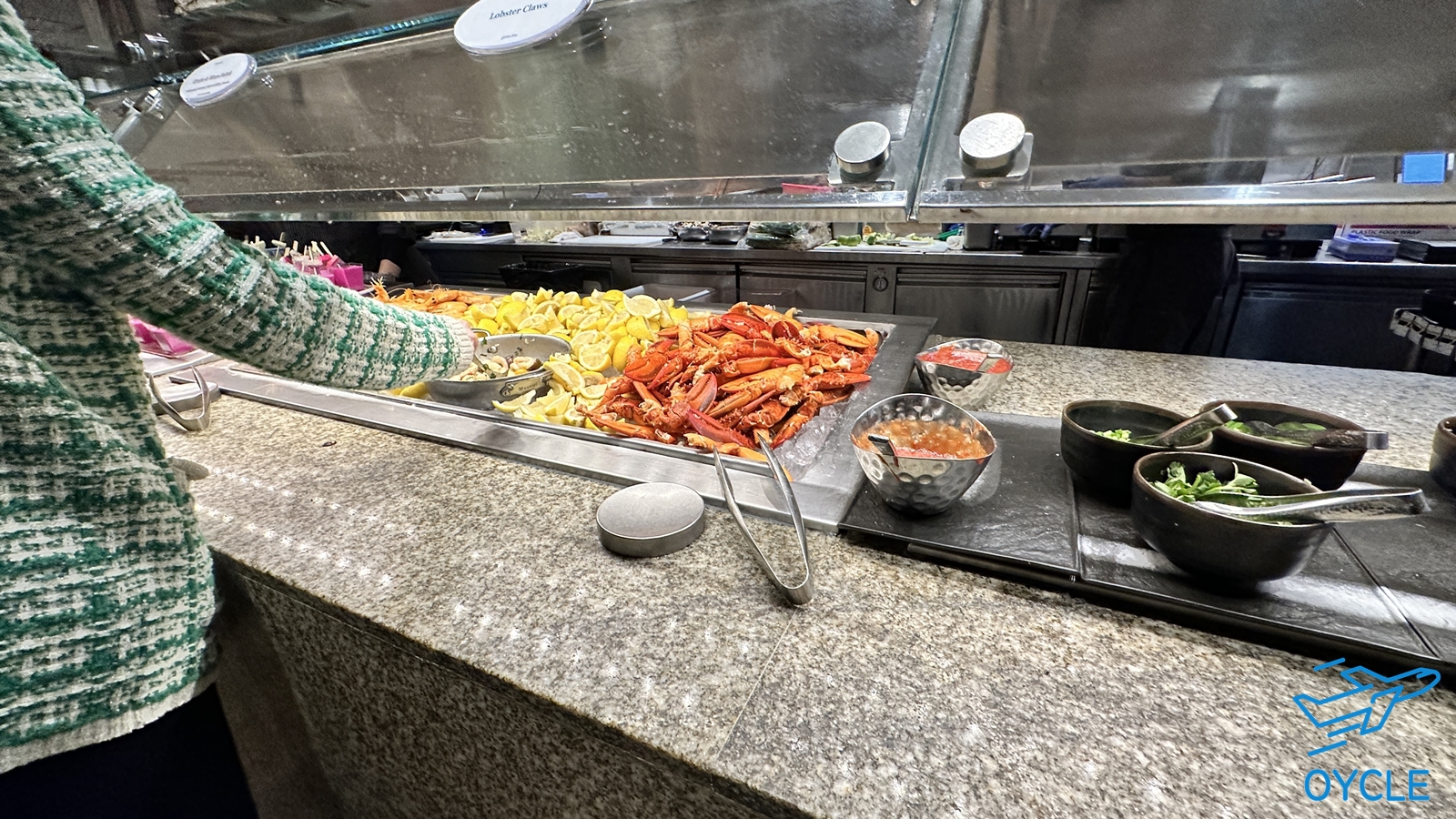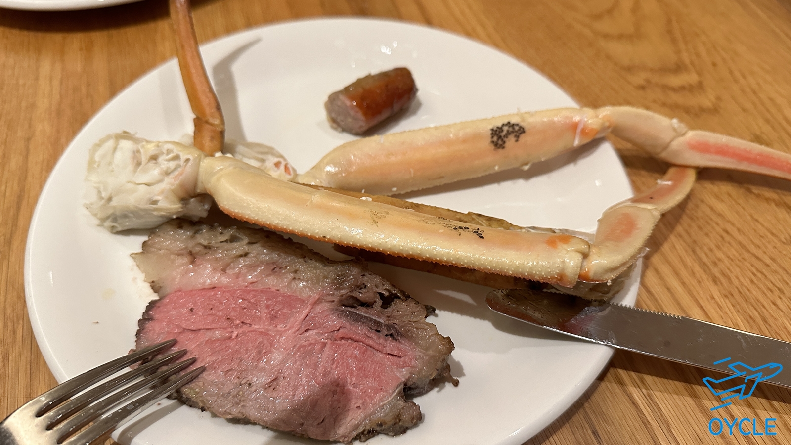 내가 가장 자주 먹었던 고기와 대게다리이다. 대게다리가 제공되는 코너는 미쳐 사진으로 찍지 못했는데 한국에서 흔히 먹었던 대게의 다리이다. 맛도 비슷하고 입맛에도 잘 맞는 메뉴라 여러번 퍼다 먹었다. 서양인 동양인 가릴 것 없이 가장 인기가 많은 메뉴 중 하나였다.