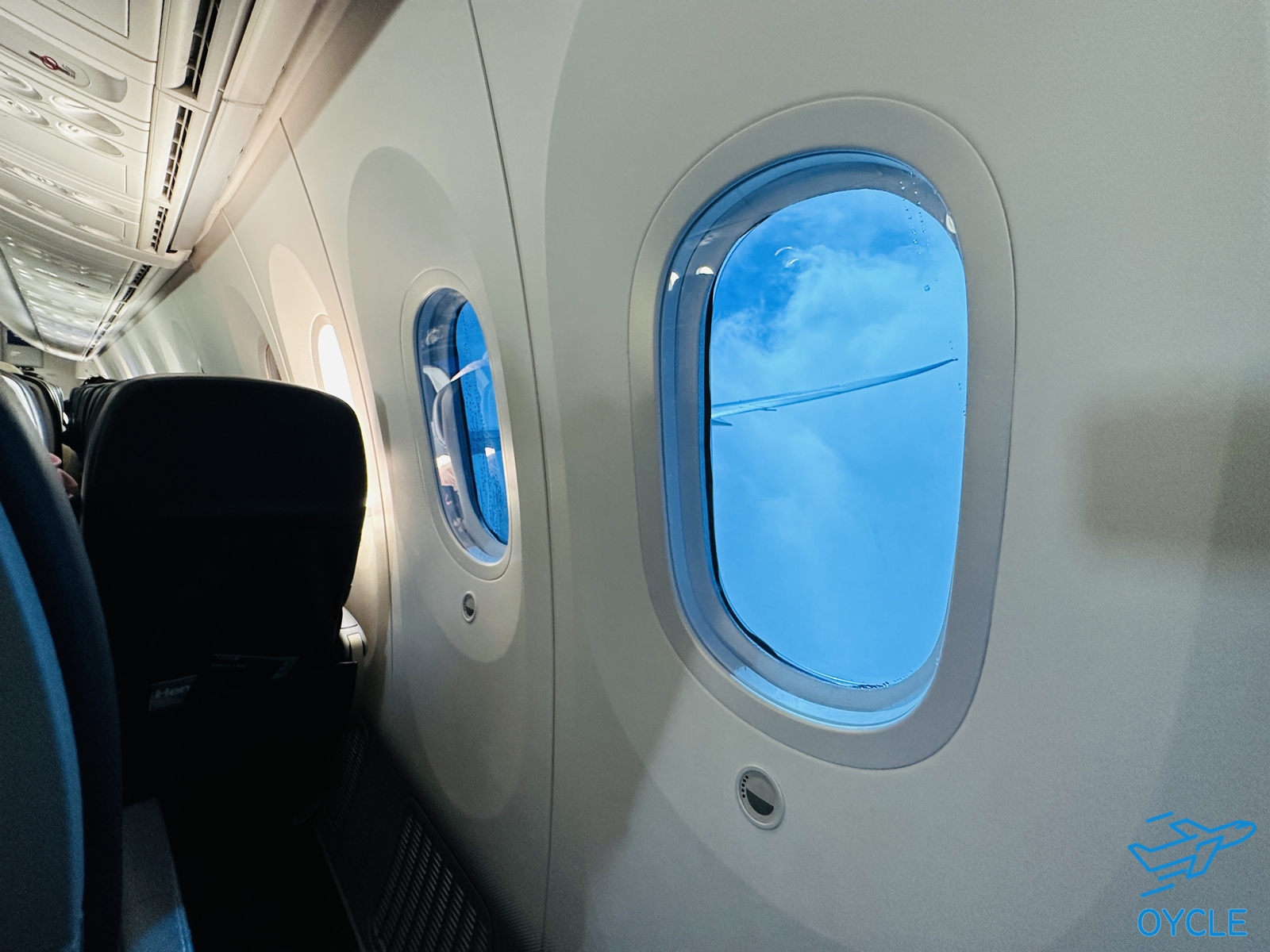 보잉사의 B787의 시그니처인 넓은 창문과 버튼을 이용한 전자식 디밍 장치. 나는 비행 중 바깥을 보는 걸 좋아하는데 창문이 넓어서 B787을 상당히 선호한다.