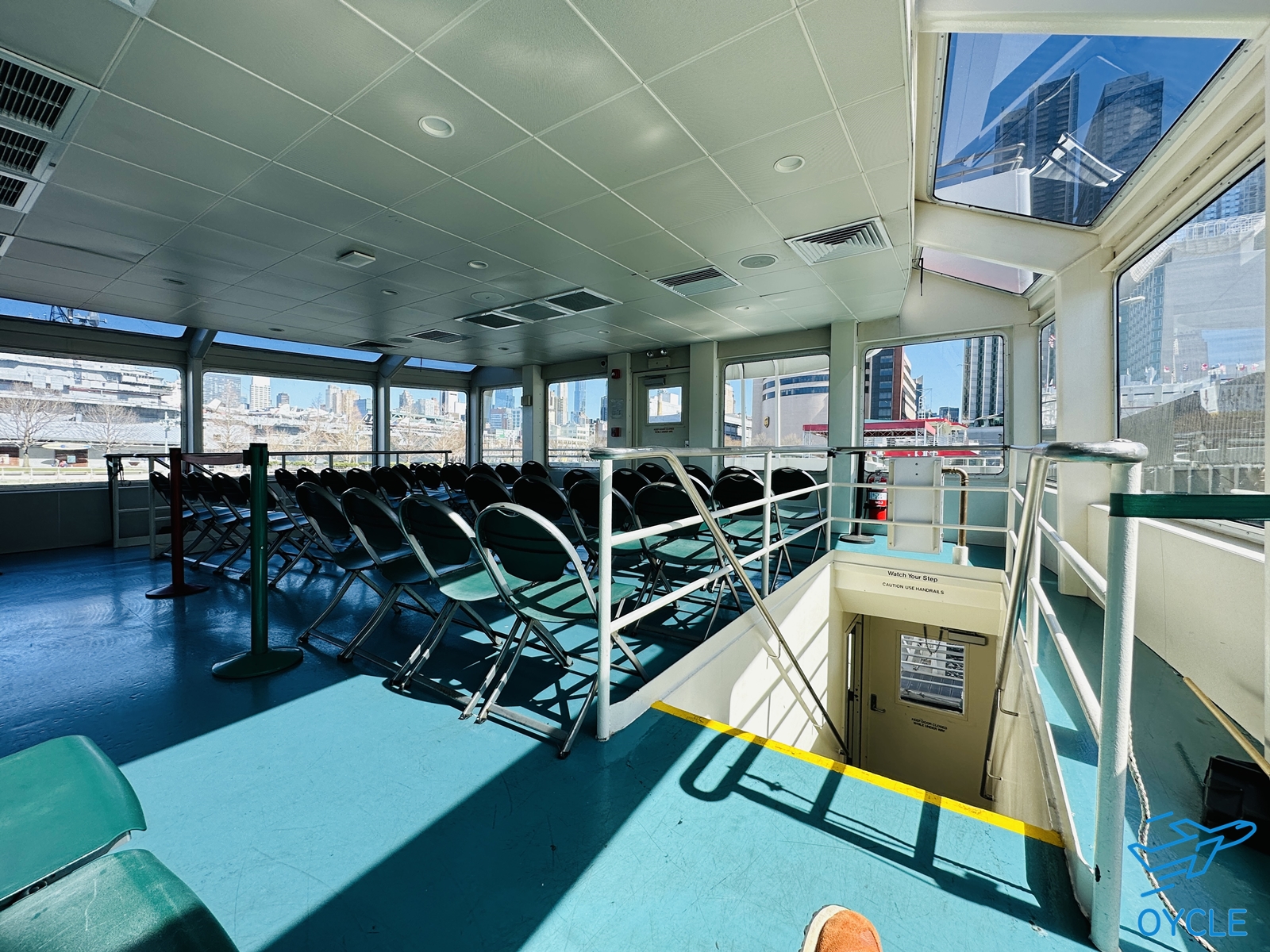 우리는 배 2층의 가장 앞쪽에 자리를 잡았다. 내가 앉은 곳의 앞 쪽에 있는 좌석은 프리미어 클래스 좌석이다. 크루즈 투어는 출발할 때는 허드슨 강을 따라 자유의 여신상이 배의 우측에서 보이게 되고 이스트강의 윌리엄스버그 다리까지 갔다가 출발한 장소로 돌아오는 경로이다.