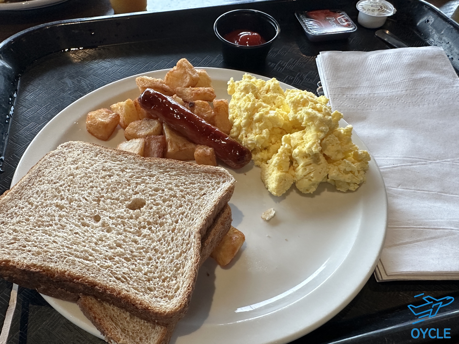 빵과 스크렘블드 에그 감자 소세지, 오믈렛 등등이 제공되었다.