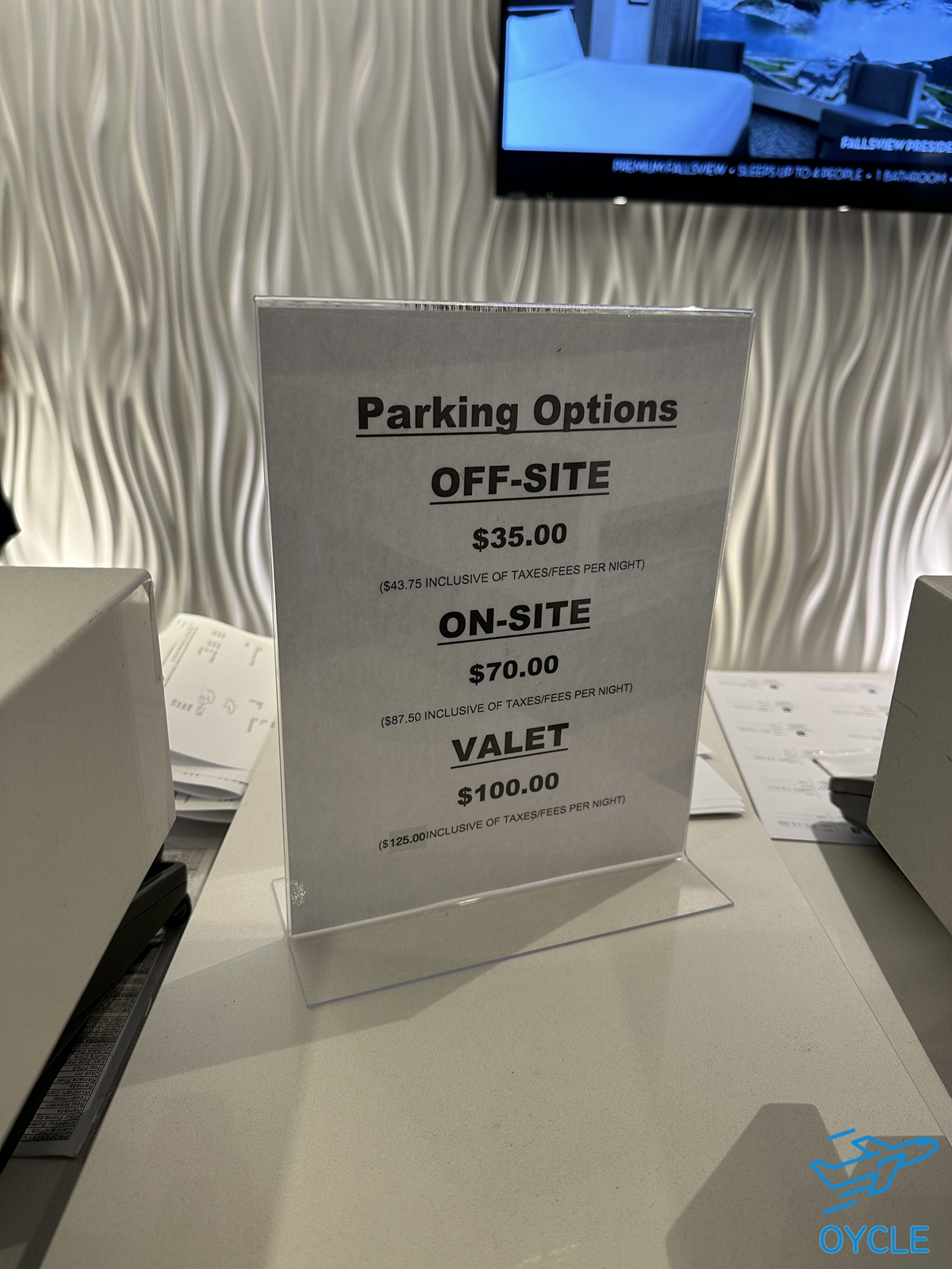 호텔 리셉션 데스크에 써있던 주차비 안내. 정말 말도 안되는 가격이지만 큰 대안이 없어서 온사이트 주차를 했다. 온사이트 주차는 호텔 지하에 셀프 주차를 하는 것이고, 오프사이트는 호텔에서 멀리 떨어진 곳에 주차하고 셔틀을 타고 오는 방식이다. 주차비에 세금까지 붙어서 거의 캐나다달러로 87.50 이다.