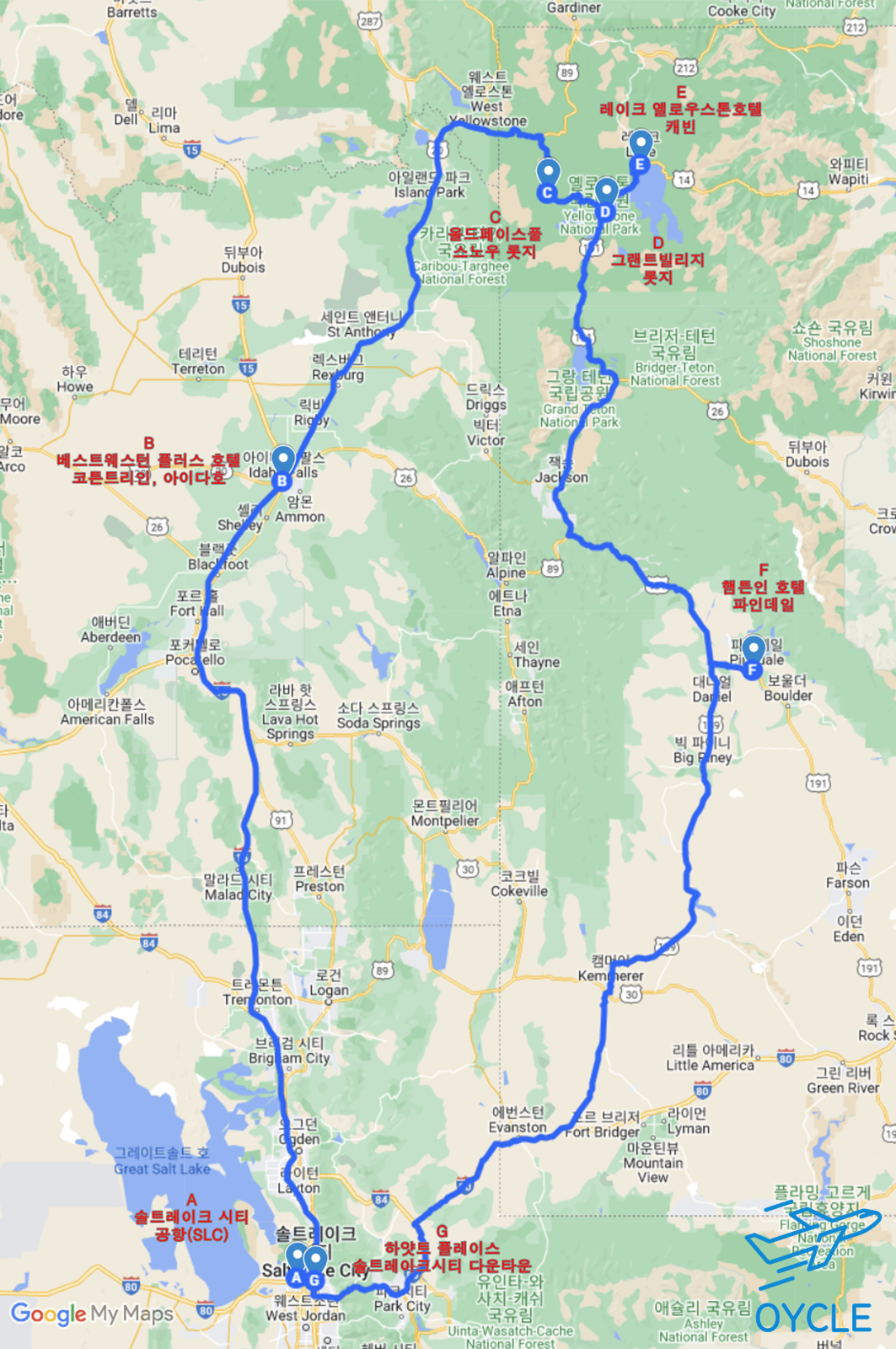 옐로스톤 여행의 첫 번째 일정은 위 지도 상 솔트레이크 시티 공항 (A) 에 내려서 아이다호 폴스 (B)까지 이동하는 루트였다. A에서 B까지의 이동경로는 대부분 고속도로였고 대략 3시간 정도 소요되었다. 고속도로에서 어댑티브 크루즈를 이용했기 때문에 운전 피로도는 높지 않았다.