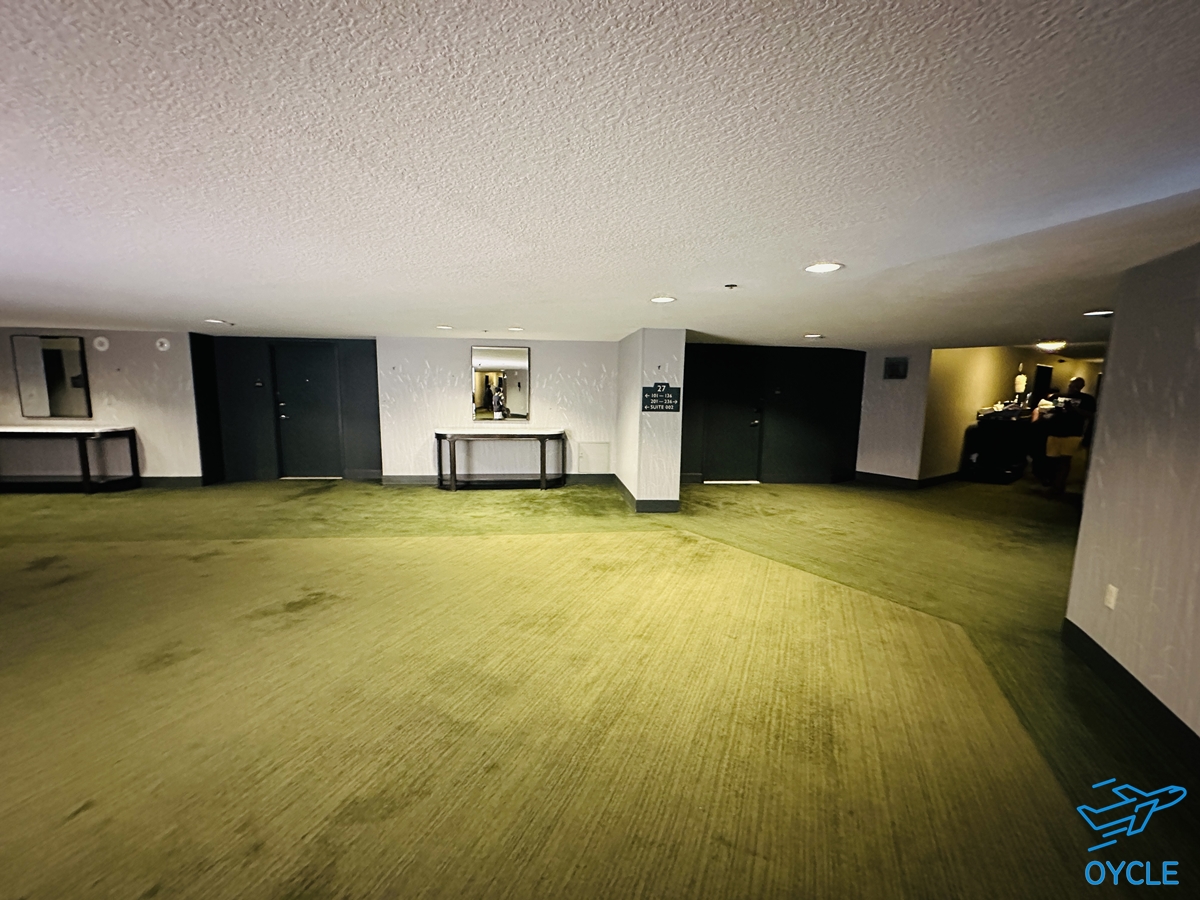 우리 객실은 27층이었는데 중앙의 엘리베이터를 내리면 좌우측 건물의 윙으로 이동할 수 있는 복도가 있다. 중앙 홀의 객실은 다 스위트 룸.
