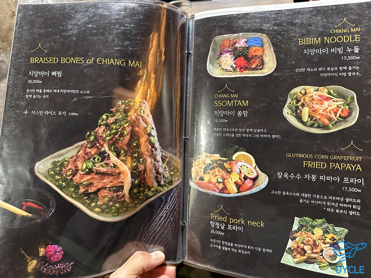 치앙마이방콕 음식점의 메뉴판이다. 전체적으로 태국 음식을 팔고 있었는데 태국 요리에 뼈찜이 있는지 모르겠지만 전에 방문했던 일행이 뼈찜이 시그니처라고 해서 주문하기로 했다. 그리고 내가 좋아하는 푸팟퐁커리도 같이 주문했다. 세 명이 방문했는데 뼈찜과 푸팟퐁커리를 주문하니 직원이 양이 많을 거라고 했다. 그래도 그냥 달라고 했고 결국엔 다 먹었다. 추가로 쏨땀까지 시켜먹기도 했다.