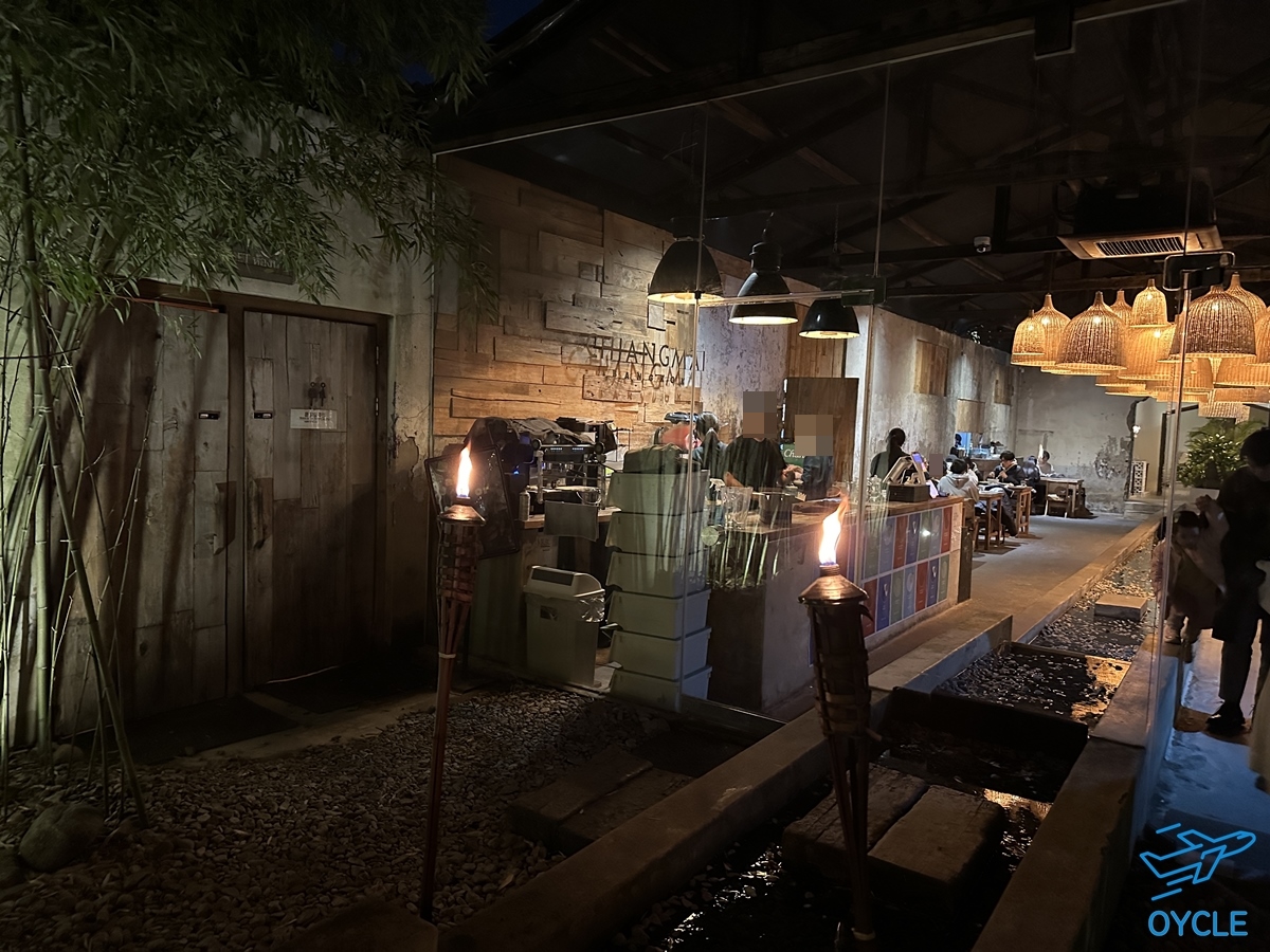 입구부터 분위기가 장난아니다. 대전 소제동은 엄청 작은 성수 느낌이랄까. 오래전 시대의 건물들을 리모델링해서 꾸며놓은 식당과 커피샵이 밀집해 있는 곳이라고 보면된다. 치앙마이방콕의 입구는 대나무로 장식되어 있었다.