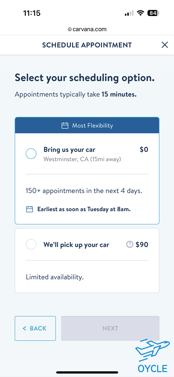 마지막 절차는 차량인도. 내가 판매할 차를 가지고 가까운 카바나 지점으로 가는 방법과 카바나에서 픽업해주는 방법이 있는데 카바나에서 차를 가져오는 것은 90달러의 수수료가 있었다. 카바나 지점이 내가 사는 곳에서 그리 멀지 않았기 때문에 차를 가지고 가서 판매한 뒤 리프트를 타고 집으로 돌아오기로 했다. Bring us your car를 누르고 차량을 가져다 줄 시간을 입력한 뒤 예약을 하면 된다.