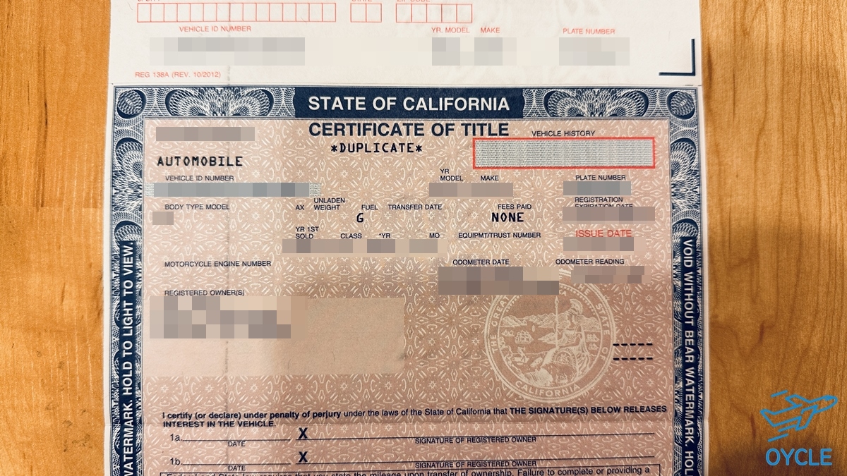 미국 차량의 소유권은 위와 같이 핑크색이라 핑크슬립/Pink Slip 이라고 불리기도 한다. 차량등록증/Registration과 다른 것이며 반드시 위 사진과 같은 소유권 서류가 있어야 차량 판매가 가능하다. 나의 경우 중고차 구입하고 한달이 지나도 title이 우편으로 오지 않아 DMV에 연락해서 다시 받았다. 그래서 서류에 Duplicate 라고 써있는 듯.