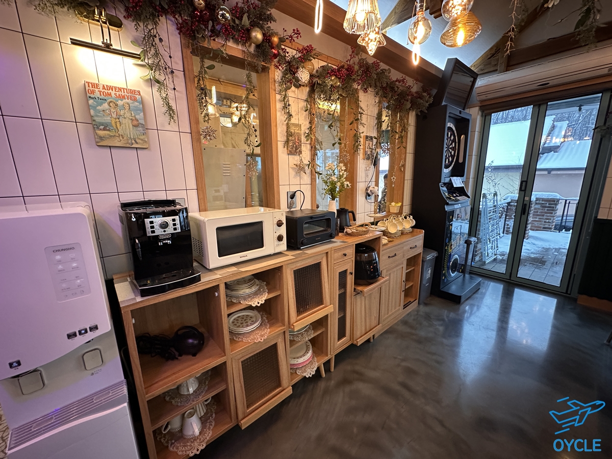 정수기, 일체형커피머신, 전자렌지, 토스터기, 밥솥 등 필요한 건 다 있다. 그리고 어른들이 재밌게 가지고 놀았던 다트머신.