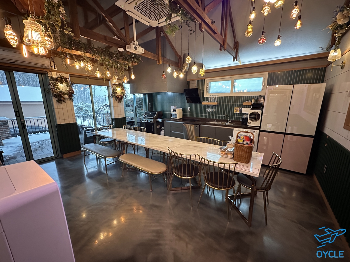 이번에 방문한 날에는 눈이 엄청난게 많이 오던 날이었다. 펜션까지 가는길에 제설이 제대로 이루어지지 않은 곳이 있다며 우회로를 이용하라고 사장님께서 전화해주셨고 다와서는 손수 눈을 치워놓으셔서 무사히 도착했다. 트리피아 더 에코는 독채 키즈 풀빌라로 위 사진에 보이는 건물을 통째로 사용하게 된다.