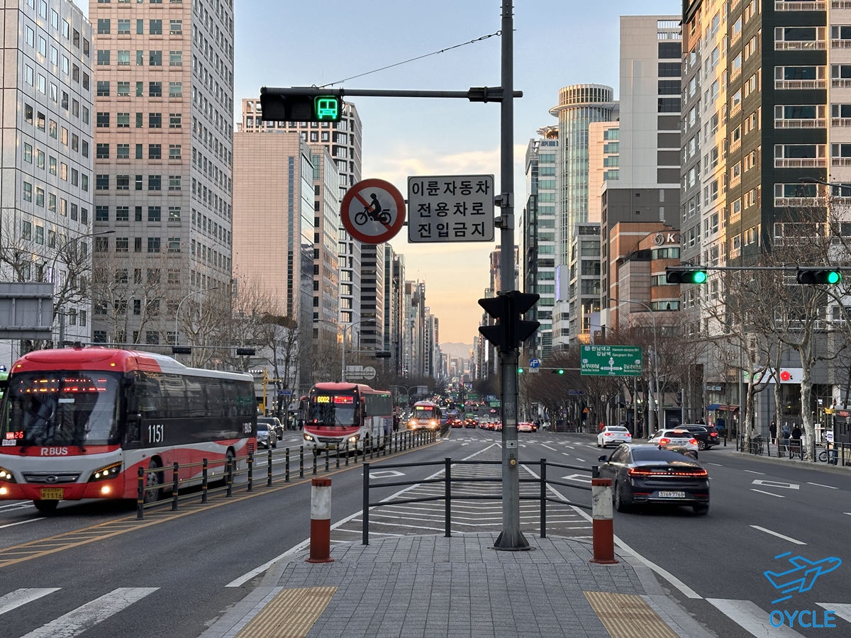 호텔 바로 앞 버스정류장에서 찍은 강남대로. 버스정류장에 버스가 참 많이 다녀서 강남권 오고가기 편했다.