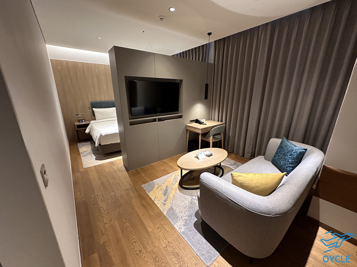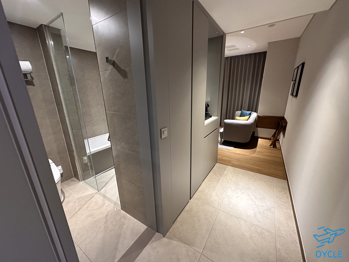 지난번에 방문한 킹 게스트룸은 객실에 들어가면 바로 침대가 보이는 구조였으나 킹 디럭스 룸은 객실에 들어가서 기역자 형태로 들어가면 쇼파와 침대가 나오는 구조이다. 일반 게스트룸에 비해 공간감은 확실히 넓은 편이다.