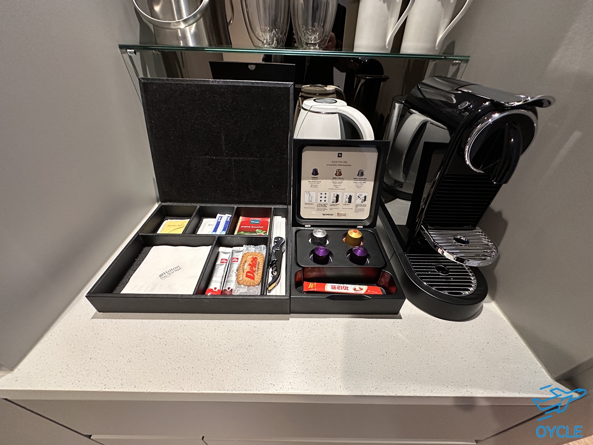 네스프레소 커피머신과 포트 등 다과할만한 것들이 냉장고 위에 놓여져 있다.