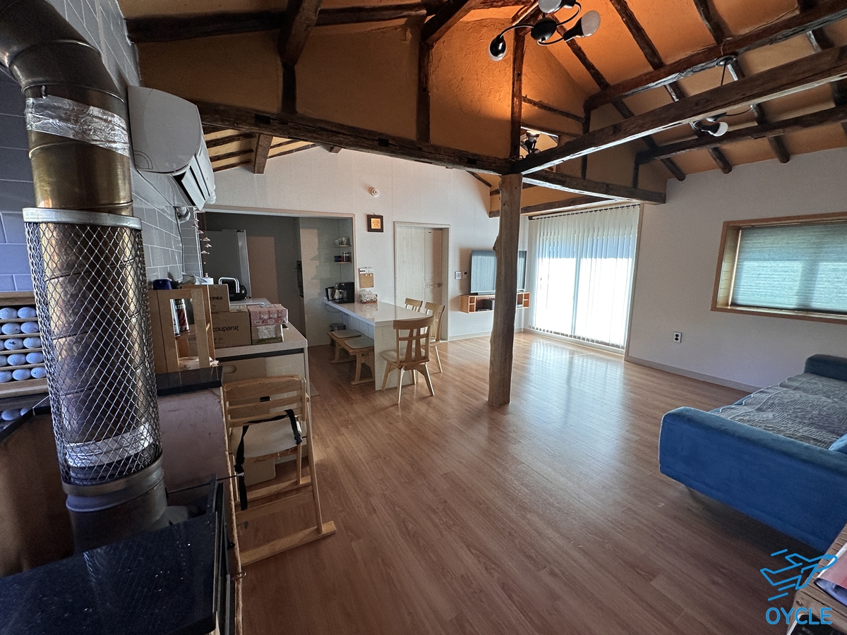 복도를 따라 들어오면 위 사진과 같은 거실이 나타난다. 오래된 가옥을 현대식으로 리모델링한 숙소로 알고 있다. 에어비앤비에 보이는 사진은 꽤 클래식한 느낌이 드는데 실제로 와보면 훨씬 현대식이다. 아이동반한 가족들이 오기 좋은 숙소이다보니 하이체어도 준비되어 있다.