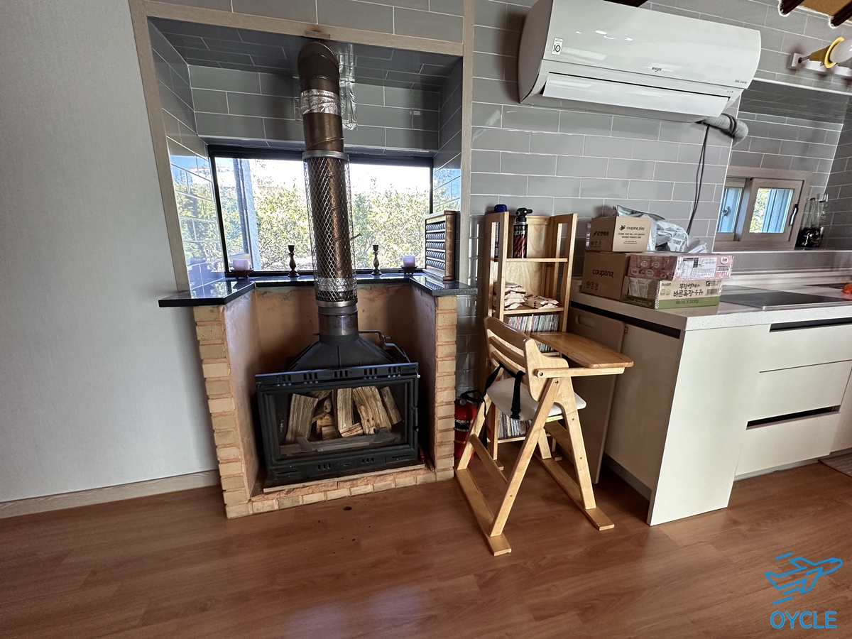 거실 옆으로는 벽난로도 있었는데 이제 막 걸음마를 배운 아기가 있어서 벽난로를 사용하지는 않았다.