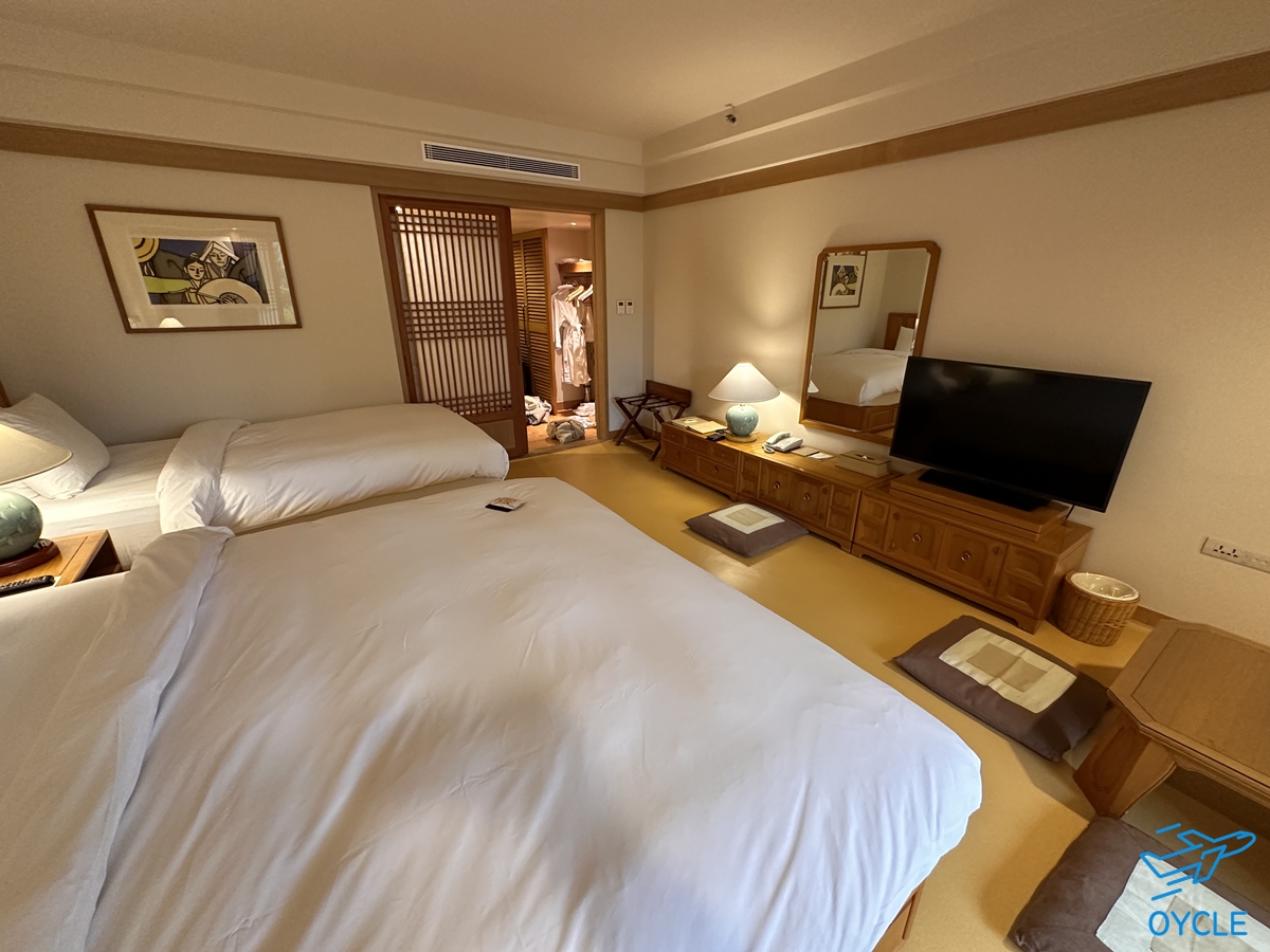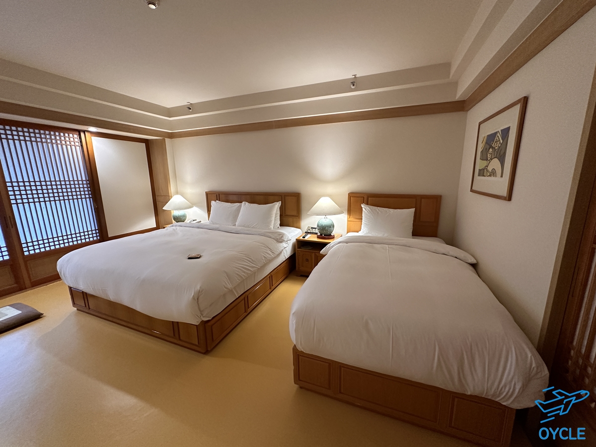 왼쪽의 침대가 조금 더 크다. 패키지 설명에는 더블이 제공된다고 하는데 같이 놀러온 가족이 예약한지라 요청이나 추가금을 통해 객실 침대 유형을 트윈으로 바꿨는지는 잘 모르겠다.