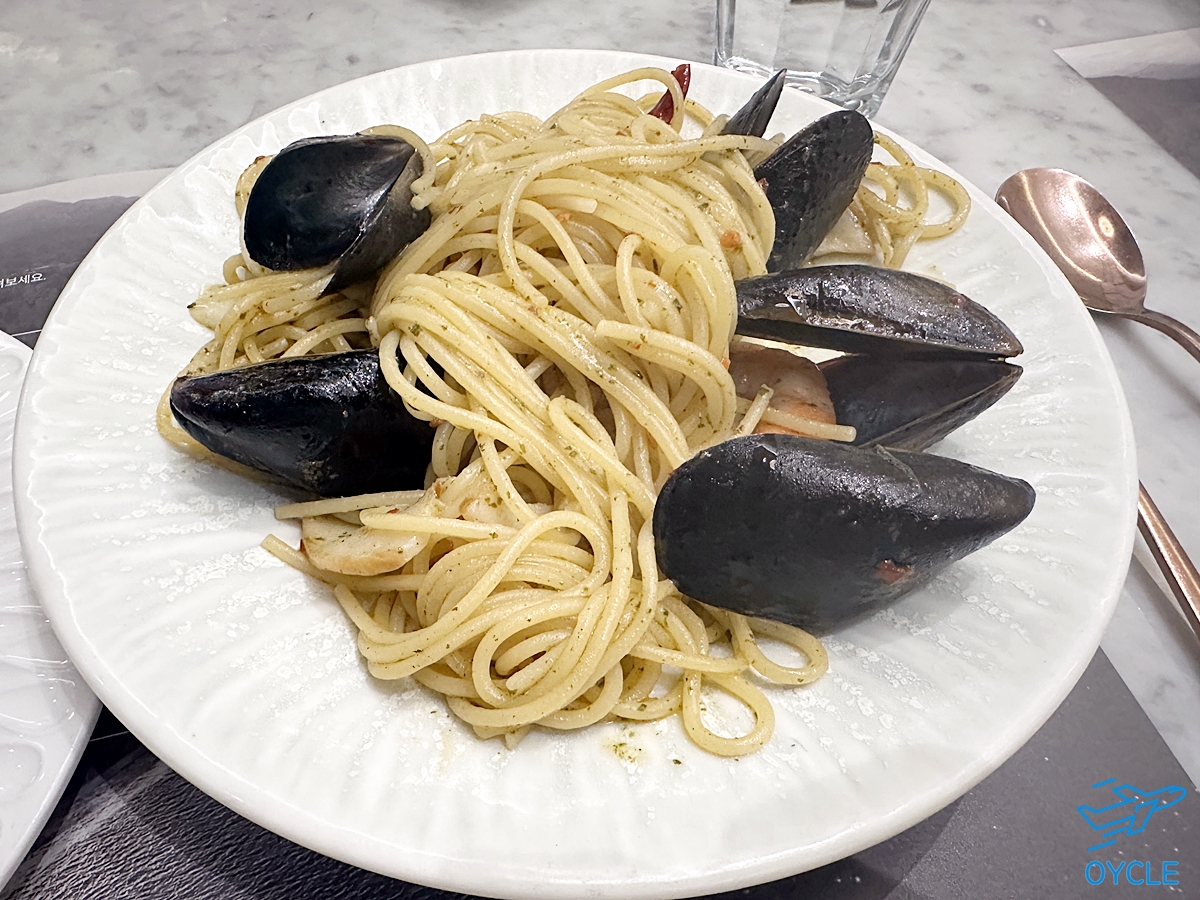 내가 주문한 디마레 오일 파스타이다. 요새 아이폰 필터설정을 바꿨더니 풍경은 이쁘게 나오는데 음식들이 맛없게 촬영된다. 사진보다 훨씬 맛있게 나온 메뉴이다. 파스타 맛도 좋은 편이었다. 다만 해산물이 조금더 다양하게 들어갔으면 좋았을 것 같다.