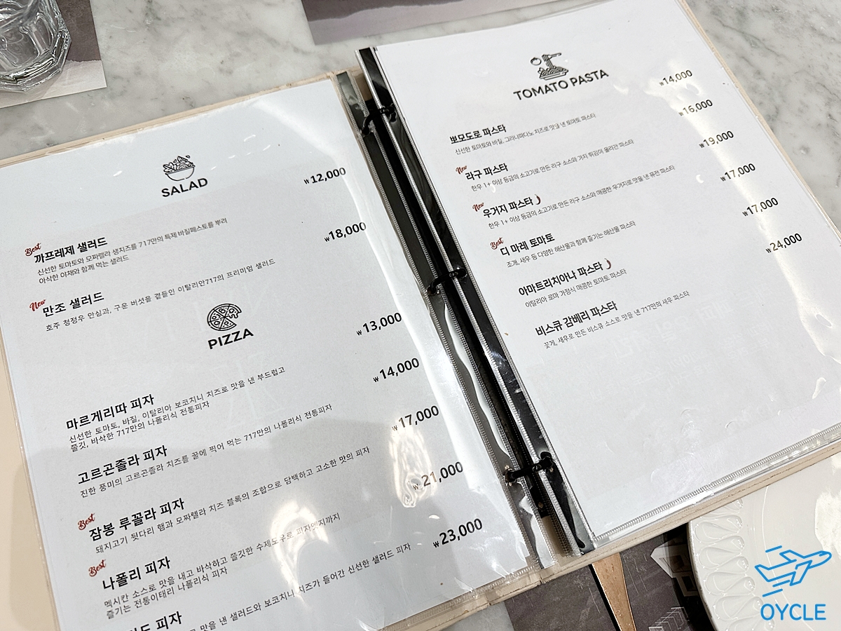 샐러드, 피자, 토마토 파스타가 메뉴판의 첫번째 메뉴였다. 피자 가격대는 13,000원부터 23,000원까지였고 토마토 베이스의 파스타는 14,000원부터 24,000원까지였다. 좋은 분위기와 풍경 생각하면 적절한 가격이지 않을까 싶다.