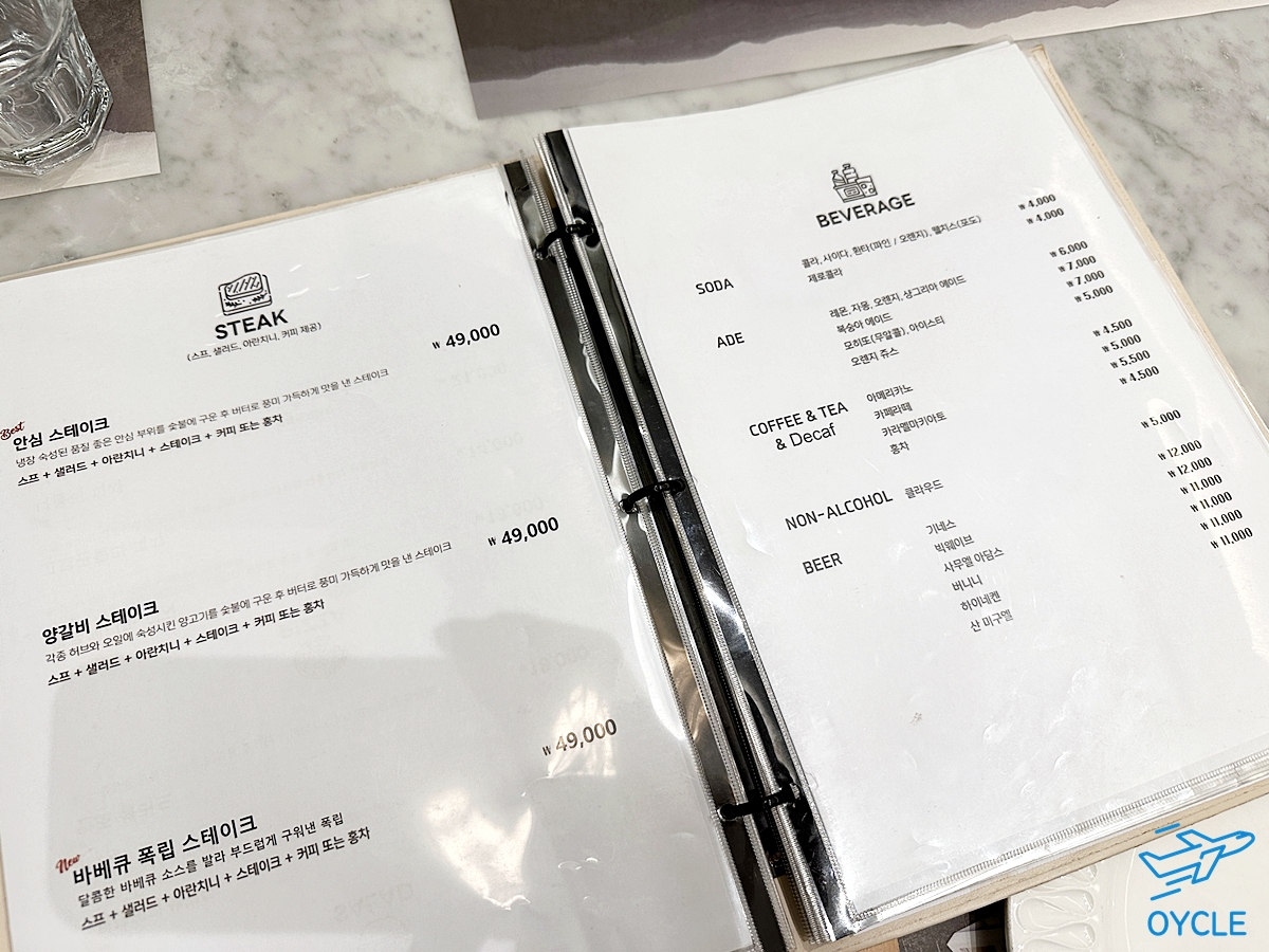 식사메뉴의 마지막에는 스테이크가 있었는데 스테이크도 소고기, 양고기, 돼지고기로 정말 다양했다. 스테이크 가격은 세 종류 모두 49,000원이었다.