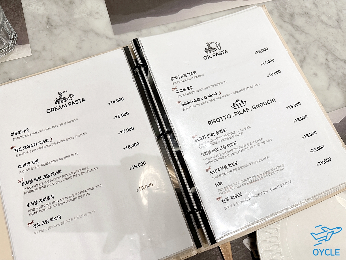 메뉴판의 다음장에는 크림파스타, 오일파스타, 리조토 등의 메뉴가 있었는데 파스타 가격대는 다 비슷비슷했는데 오랜만에 이렇게 파스타 종류가 많은 곳을 방문한지라...메뉴를 고르는데 고민이 많았다.