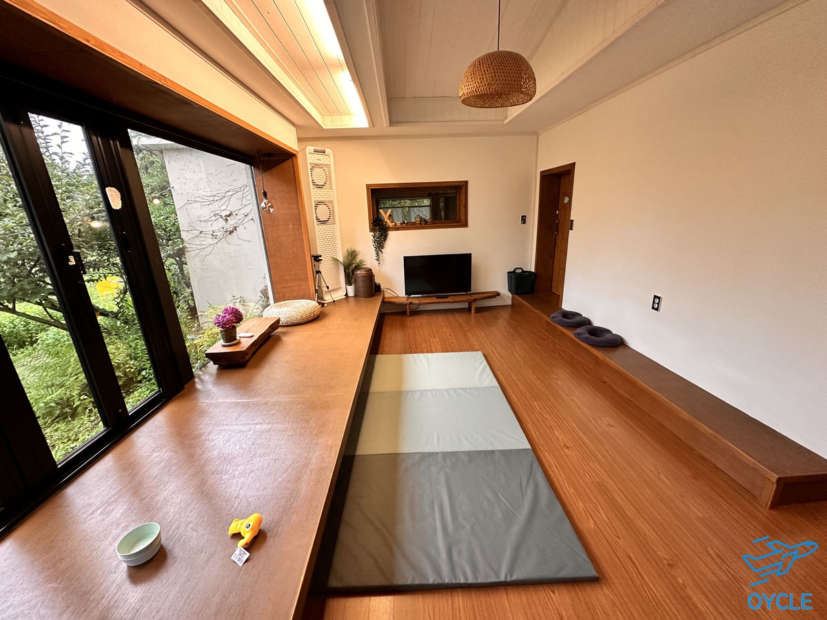 숲바는 거실의 큰 마루가 참 인상적이었던 곳이다. 마루에 앉아 통창으로 펼쳐지는 녹색의 숲을 보면서 시간 떼우면 그것만큼 훌륭한 힐링이 있을까 싶다.