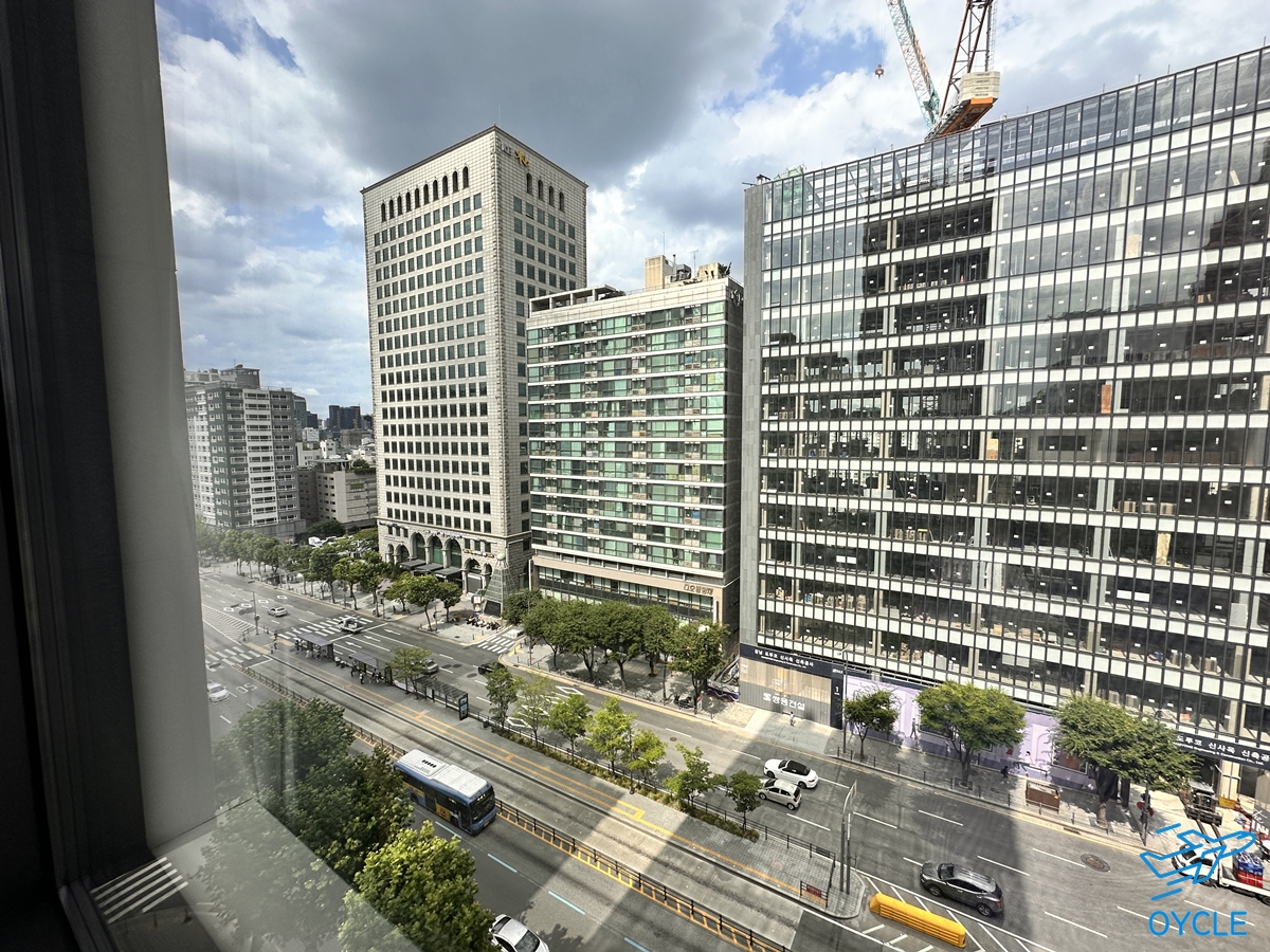 객실에서 보이는 외부 풍경은 위와 같다. 강남대로가 보이는 풍경이다. 1월만 해도 정면의 건물에 뼈대만 있었는데 이제 유리창도 붙이고 거의 다 지어간다.