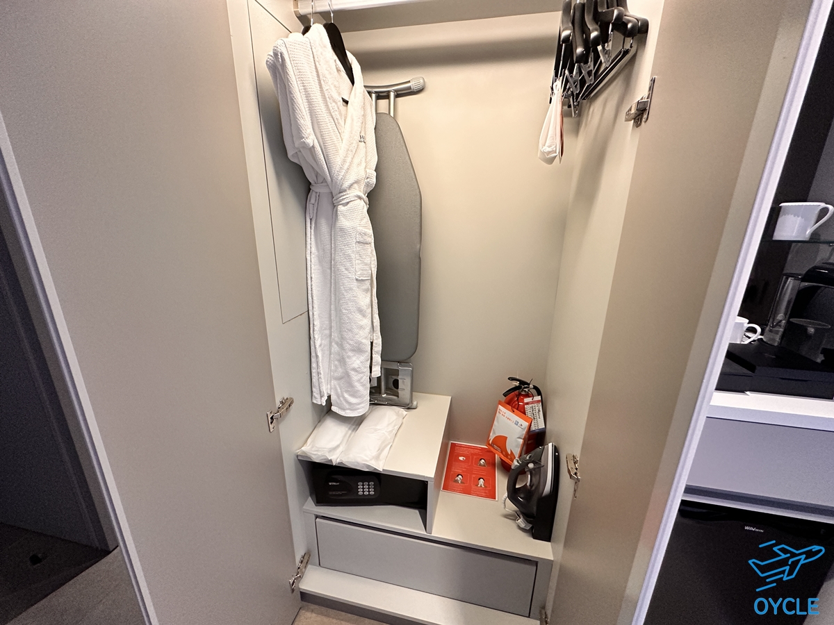 옷장에는 금고, 샤워가운, 다리미, 슬리퍼가 비치되어 있다. 외국, 특히 미국에선 비싼 호텔에 가야만 슬리퍼를 제공해주는 경우가 많은데 우리나라 호텔은 슬리퍼를 주는 곳이 많아서 참 좋다.