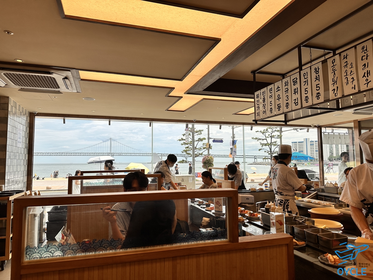 앞선 지도에서도 볼 수 있듯이 갓덴스시 광안점은 광안리 해수욕장 정중앙에 위치하고 있다. 그 유명한 광안리 해변 바로 앞에 회전초밥집이라니. 위치적으로 엄청나다.
