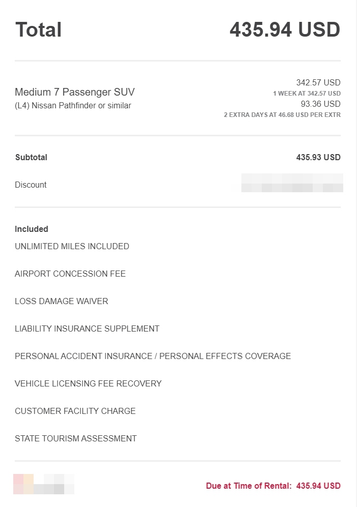 4인 가족이 꽤 장거리 여행을 해야했기에 SUV 차량을 선택했고 L등급 차량은 조금 작을 수 있을 것 같아 L4등급 차량을 예약했다. 예약시에 L4 등급 차량 예시로 닛산 패스파인더(Nissan Pathfinder) 차량이 제시되었다. 나의 경우 보험은 거의 다 가입하고 있다. 제일 중요한건 LDW(Loss Damage Waiver) 정확히 말하면 보험은 아니고 자차 피해 시 면책금을 제외하고는 따로 보상하지 않는 부가항목이다. 그리고 모든 렌트카의 대인대물 보험은 기본으로 가입하게 되는데 혹시 모를 대형 사고를 대비해서 LIS(Liability Insurance Supplement)도 간간히 추가하는 편이다. LIS에 가입하면 왠만한 대인대물 한도가 얼마인지 정확히 모르겠지만 초 대형 사고도 다 커버될 정도이다. 그리고 이번엔 Personal Accident Insurance도 가격차이가 거의 없길래 가입해보았다. 내 몸이 다치거나 소지품을 털렸을 때 보상받을 수 있는 보험이다. 아마 이번 렌트에서는 가격 비교시 그 차이가 거의 없어서 더 추가할게 없을 정도로 선택가능한 항목들은 다 가입한 듯 하다. 그렇게 해서 최종 렌트 금액은 9일간 435달러정도였다.