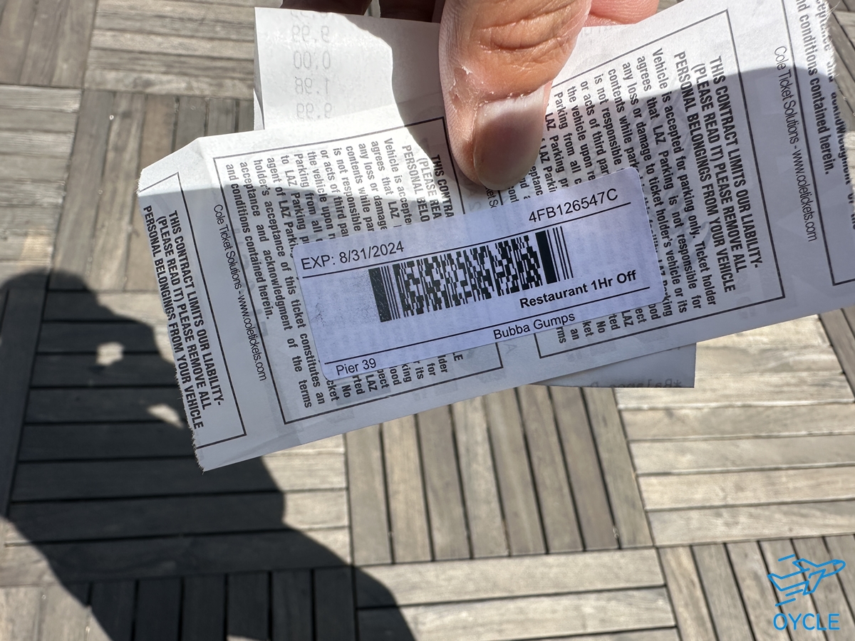 피어39에 위치한 모든 식당에서 주차할인을 해주는지는 잘 모르겠지만 우리가 방문한 부바검프에서는 1시간 할인권을 제공해주므로 식사하는 경우 주차비가 그렇게 비싼 편은 아니다. 피어39 공영주차료는 한시간 10달러이다.