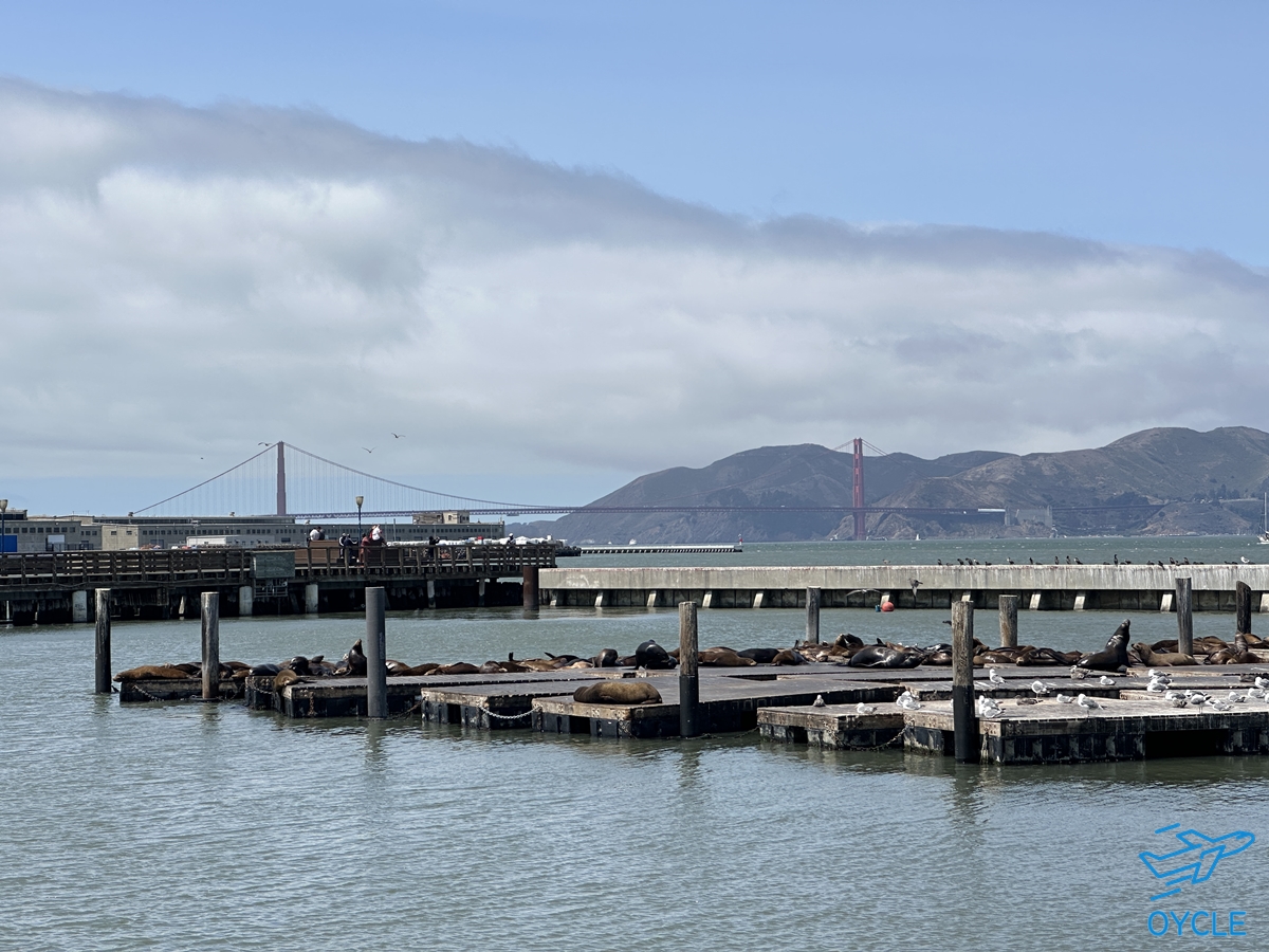 피어39 명물이라고 할 수 있는 바다사자들. 수년전에 방문했을 때는 데크가 모자랄 정도로 엄청나게 많았는데 언제부턴가 그 수가 많이 적어진 느낌이다. 그 뒤로 금문교도 살짝 보인다.