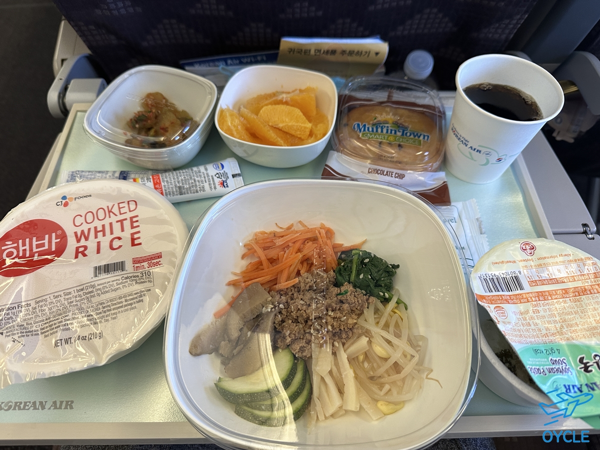 대한항공의 대부분 장거리 노선에서는 두번의 기내식과 한번의 간식이 제공된다. 첫 번째 기내식은 개인적으로 속이 가장 편한 비빔밥으로 선택.