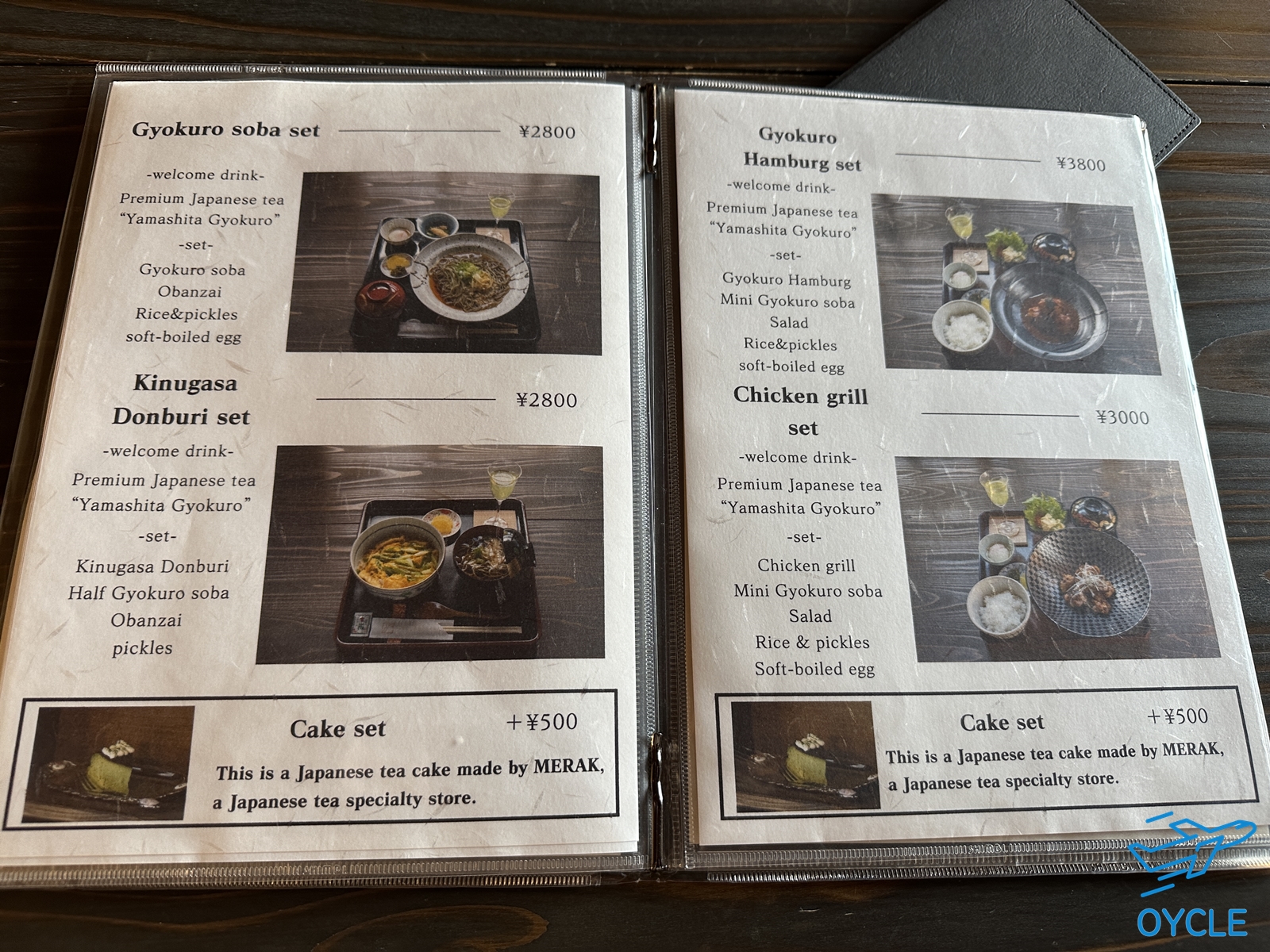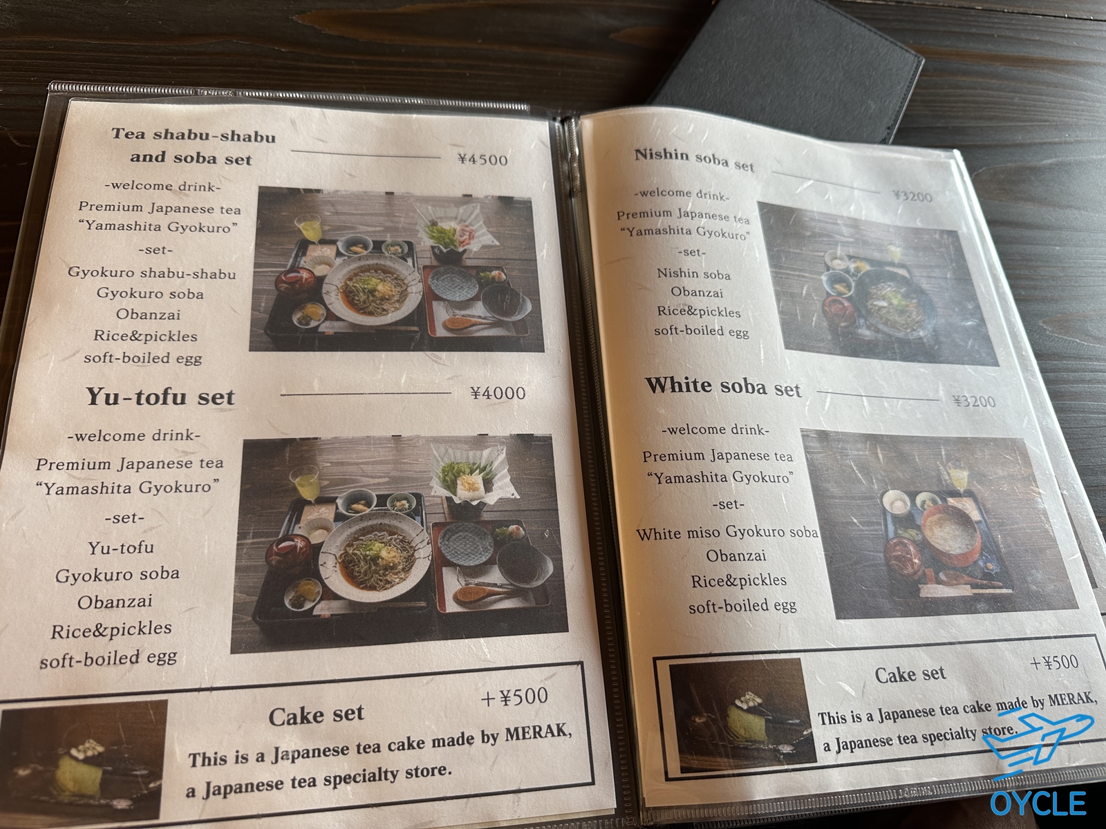 사보 킨카쿠안 음식점의 메뉴이다. 영어로 된 메뉴가 있어서 다행이었다. 기본 소바가격은 2800엔으로 살짝 가격대는 있는 음식점인데 워낙 분위기도 좋고 쉴 수 있는 공간이 좋아서 전혀 돈이 아깝지 않았다.