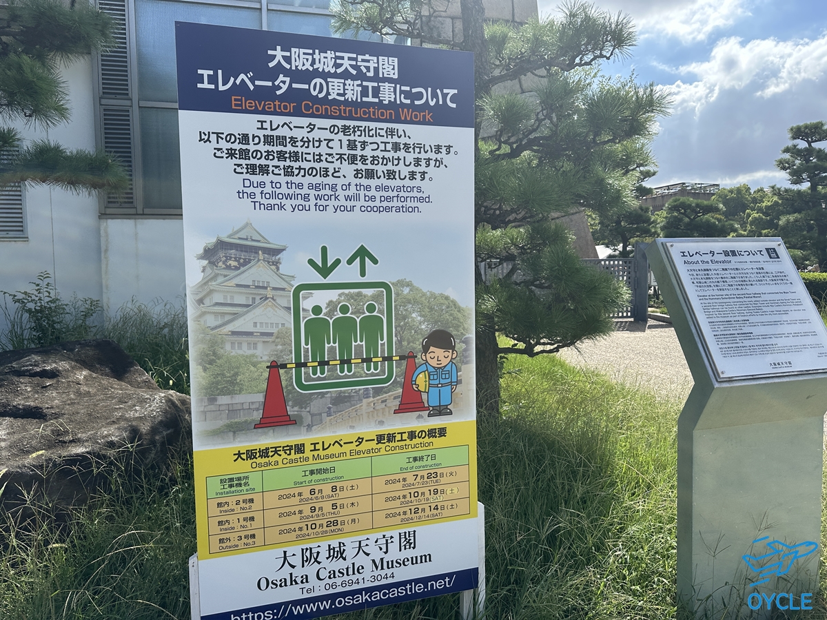 이렇게 더운날씨에 오사카 성 상부로 향하는 엘리베이터는 수리중이었다. 대략 2024년 12월 중순정도 되어야 공사를 마치고 엘리베이터가 정상적으로 작동할 듯 하다.