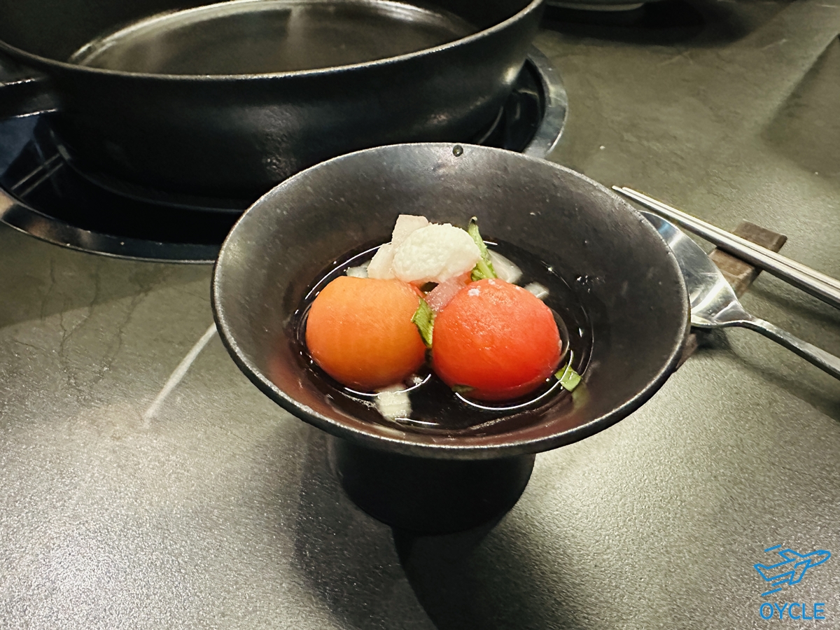 캐비어와 한우육회가 제공되었는데 캐비어 맛은 잘 모르지만 특별한 느낌으로 잘 먹었다. 한우 육회는 감태와 러스크에 싸서 먹기를 추천받았는데 이 조합으로 육회를 먹어본건 처음이었지만 나름 괜찮은 편이었다.